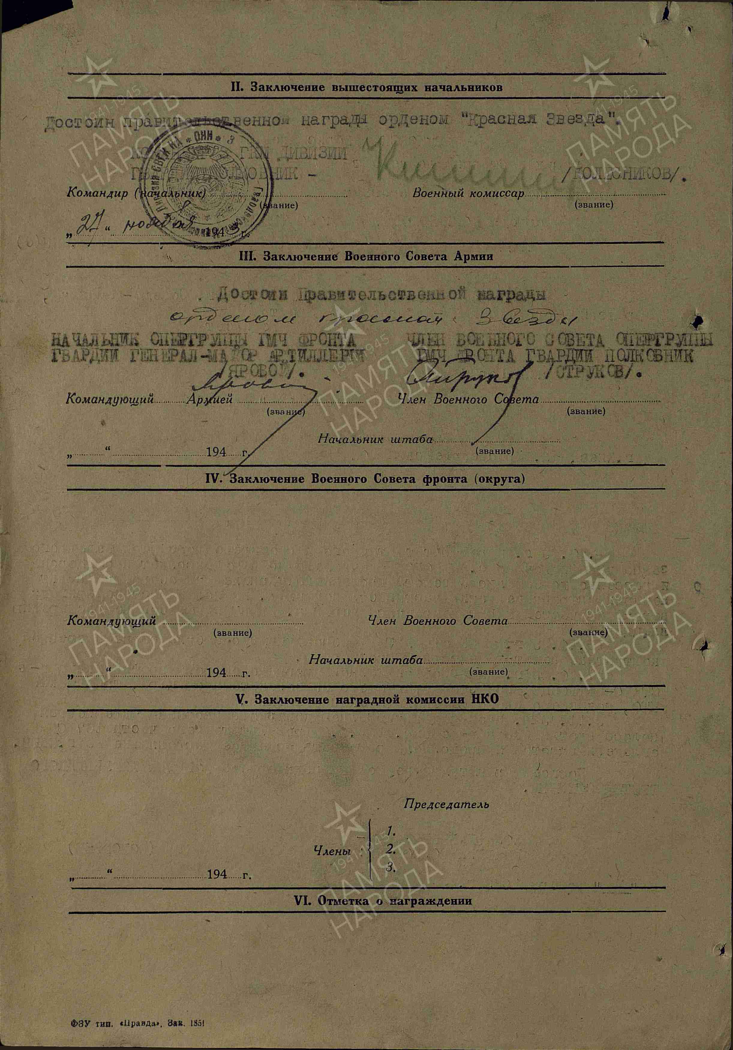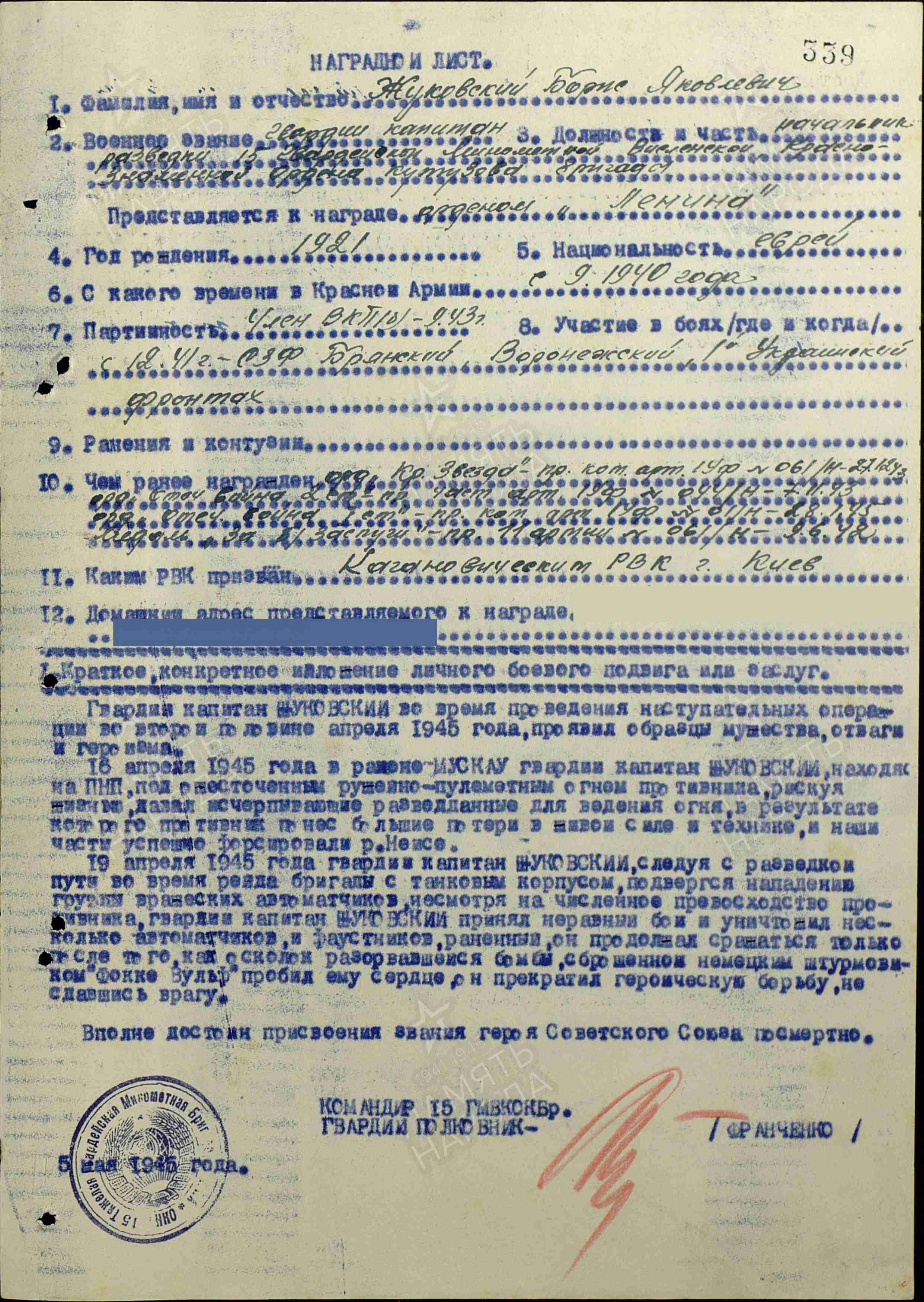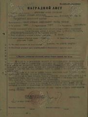 Посмертно представлен на присвоение звания Героя Советского Союза, но по данному наградному листу отмечен орденом Отечественной Войны 1-й степени.