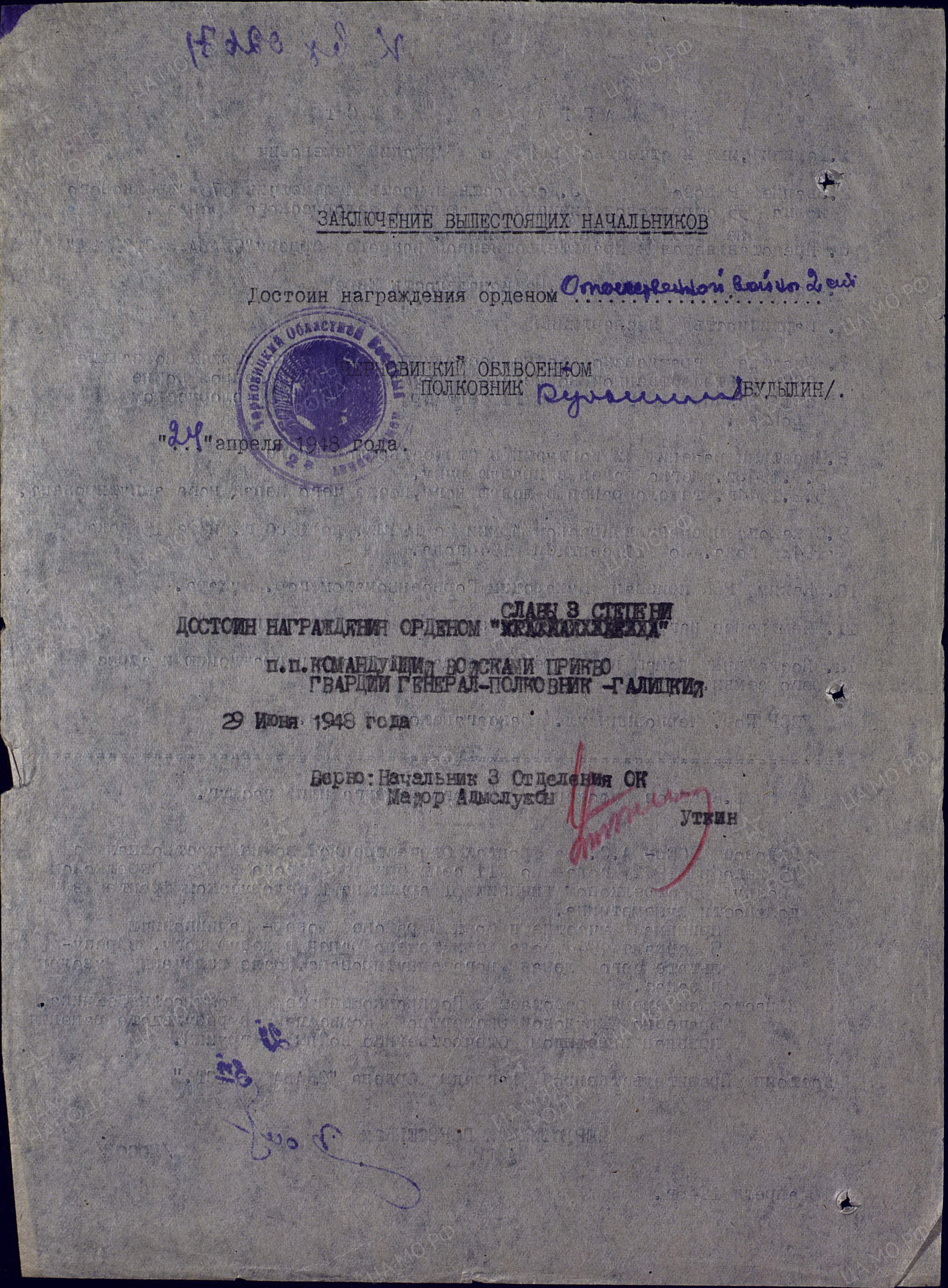 В 1948 году как инвалид войны, не отмеченный на фронте наградами, военным комиссаром города Черновцы был представлен к награждению орденом Славы 3-й степени. Областной военком повысил статут награды до ордена Отечественной войны 2-й степени, но в штабе Прикарпатского военного округа вернули начальное представление.