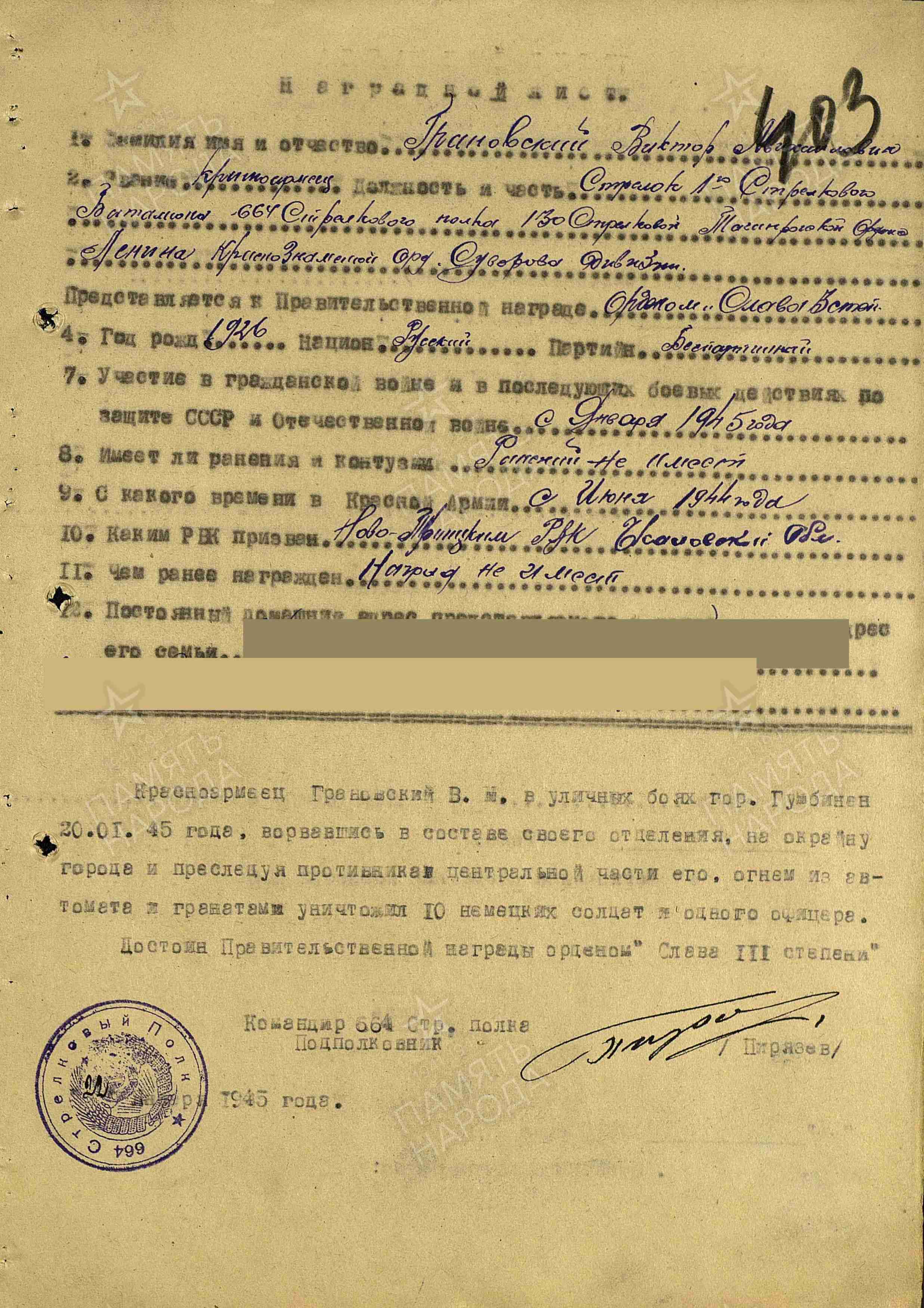 Грановский Виктор Моисеевич. Орден Отечественной войны I степени