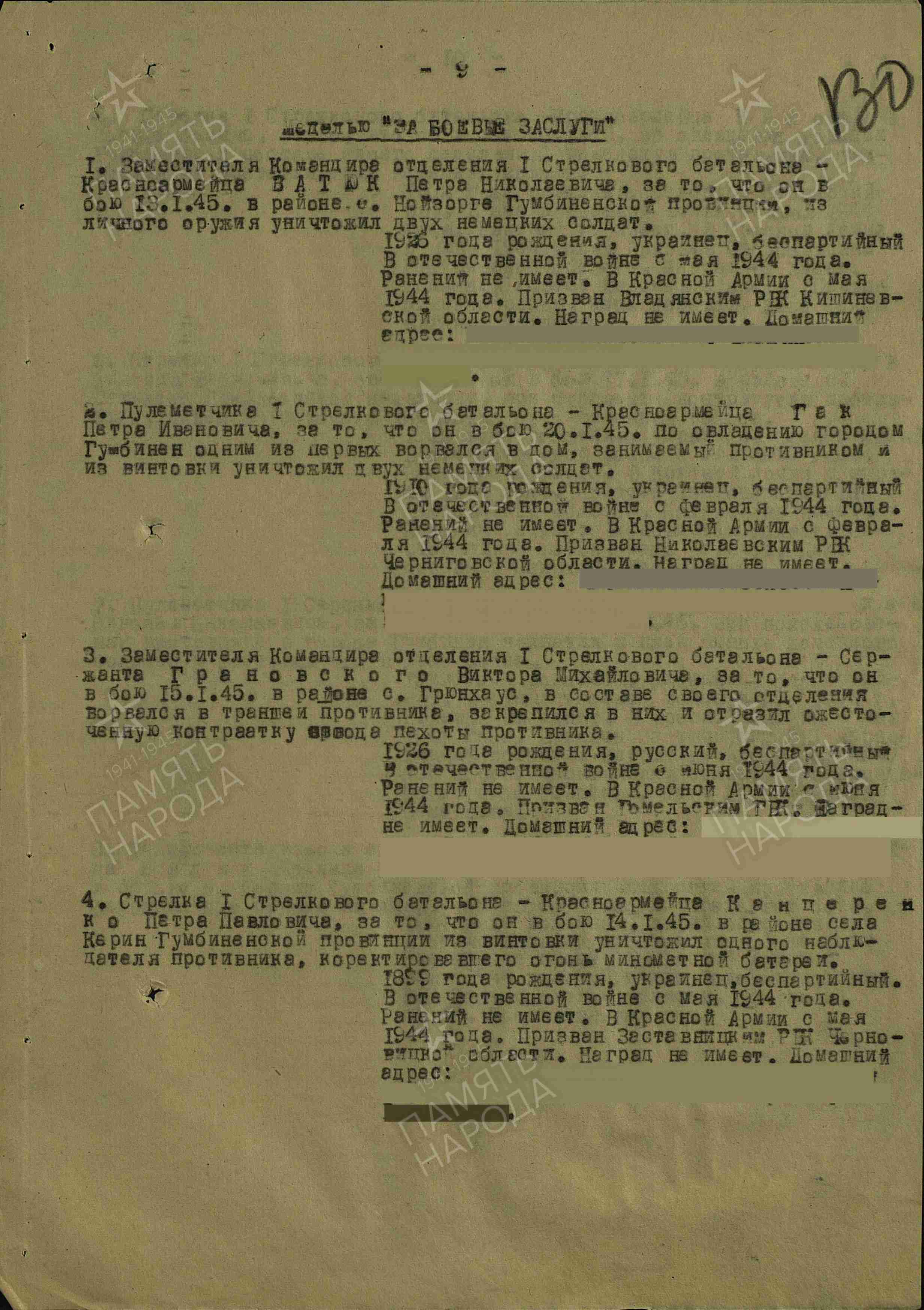 | 20.01.1945 | Медаль «За боевые заслуги» |