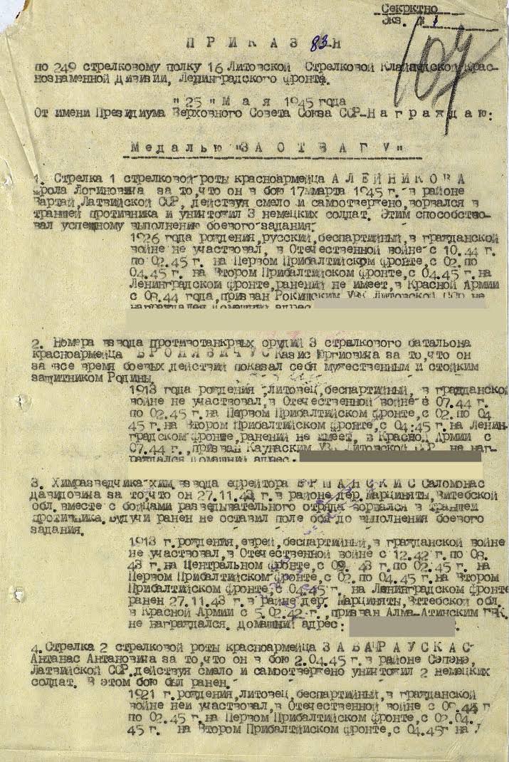 хим.разведчик химического взвода 249-го стрелкового полка, 16-й стрелковой Литовской Клайпедской Краснознамённой дивизии, 22-го гвардейского стрелкового корпуса, 6-й гвардейской Армии, Ленинградского фронта.