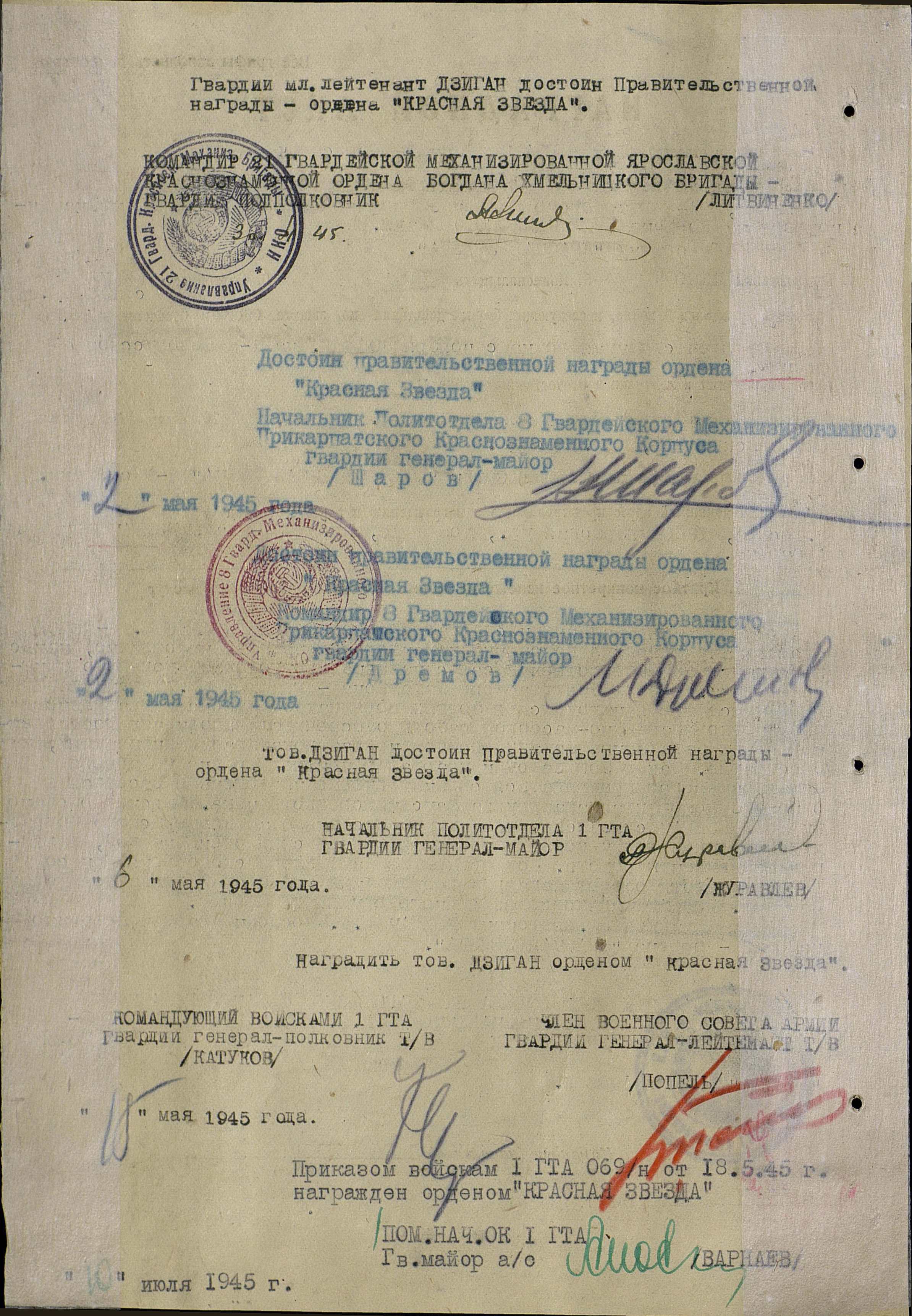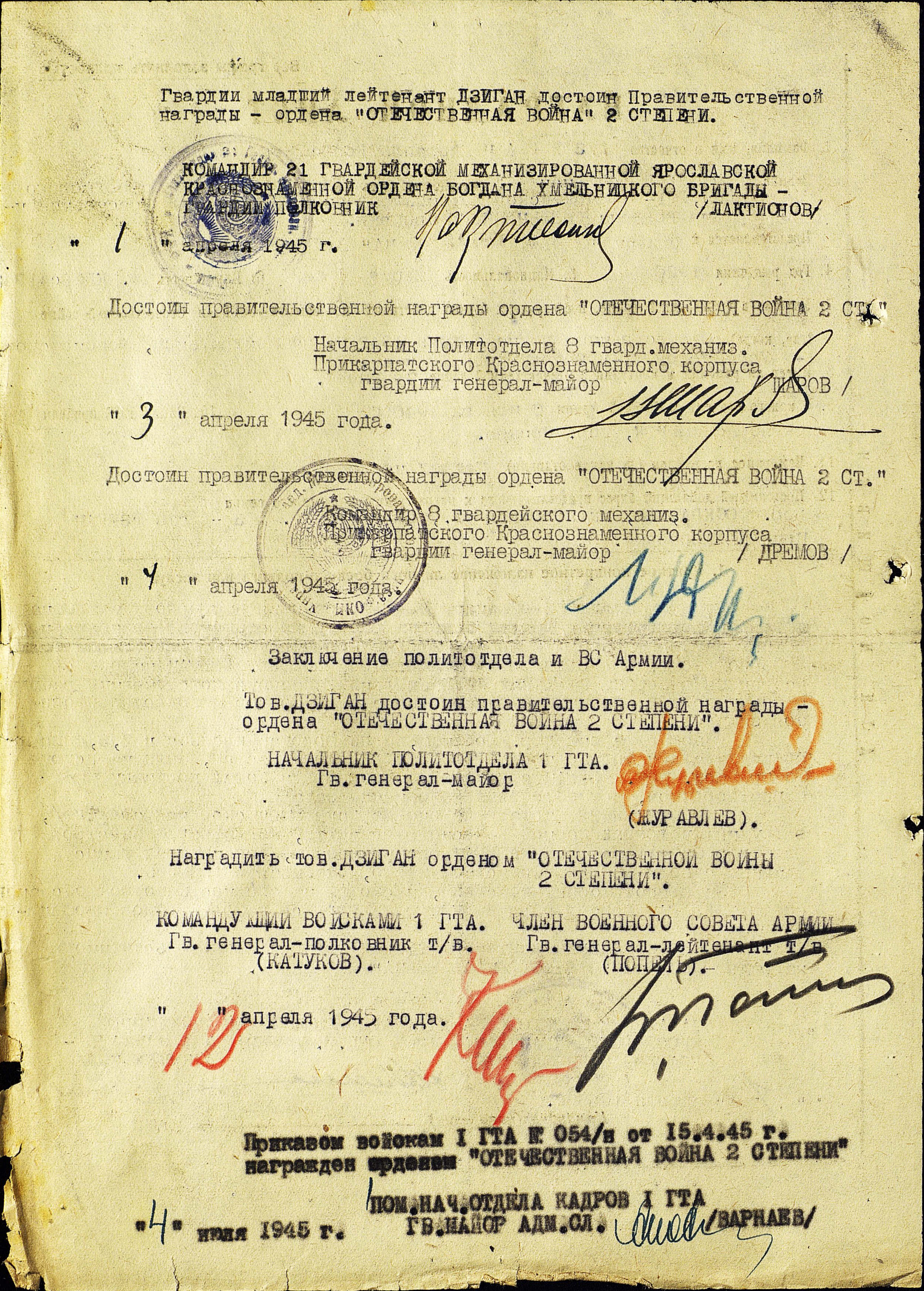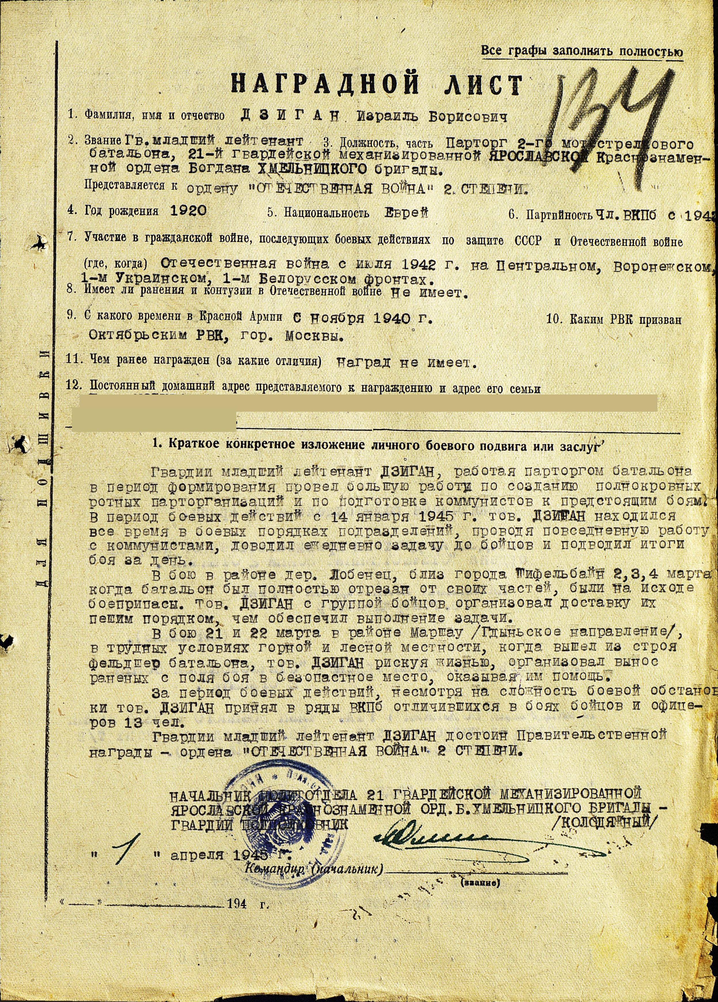 Победу встретил в должности  парторга 2-го мотострелкового батальона, 21-й гвардейской механизированной Ярославской Краснознаменной бригады.