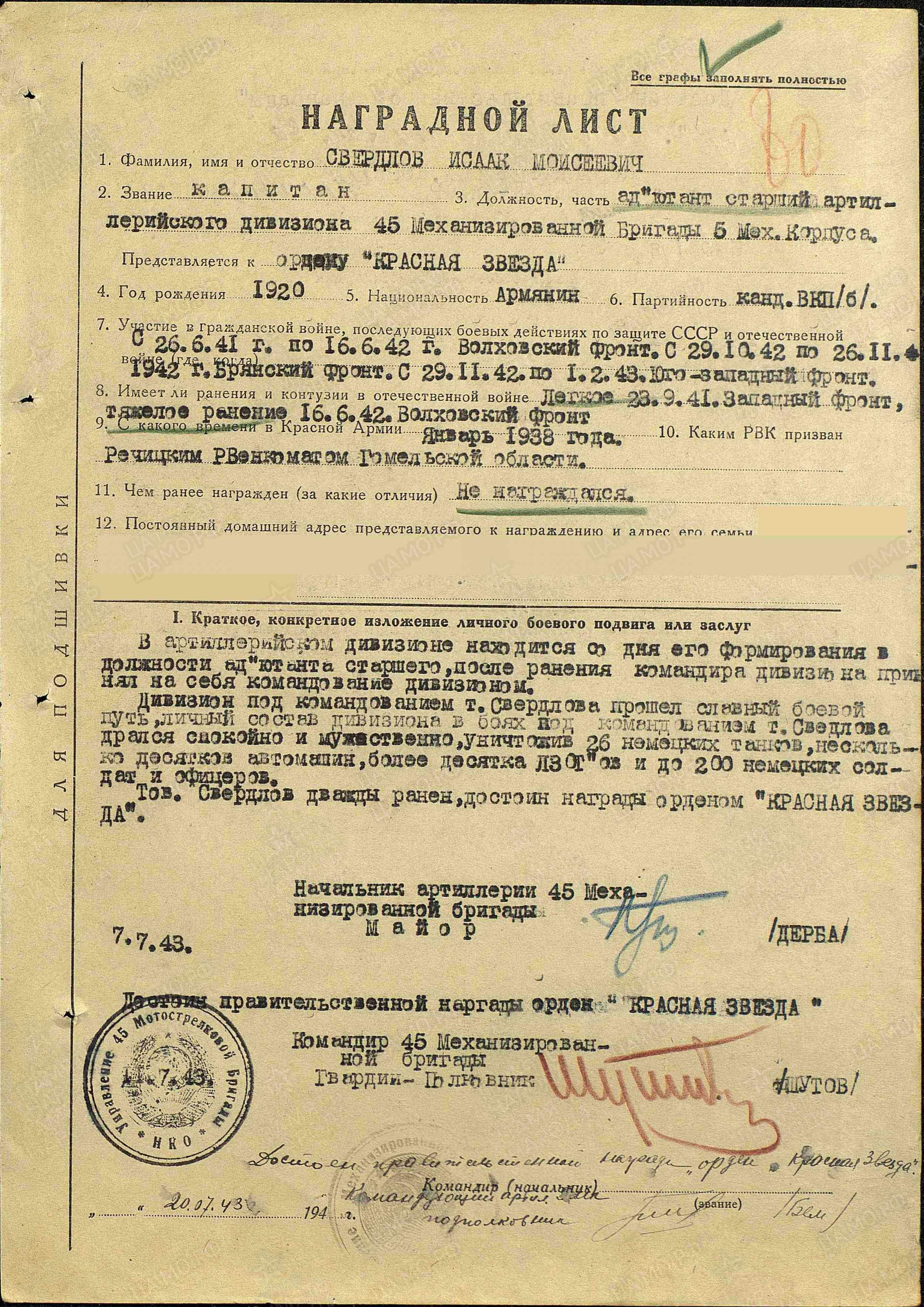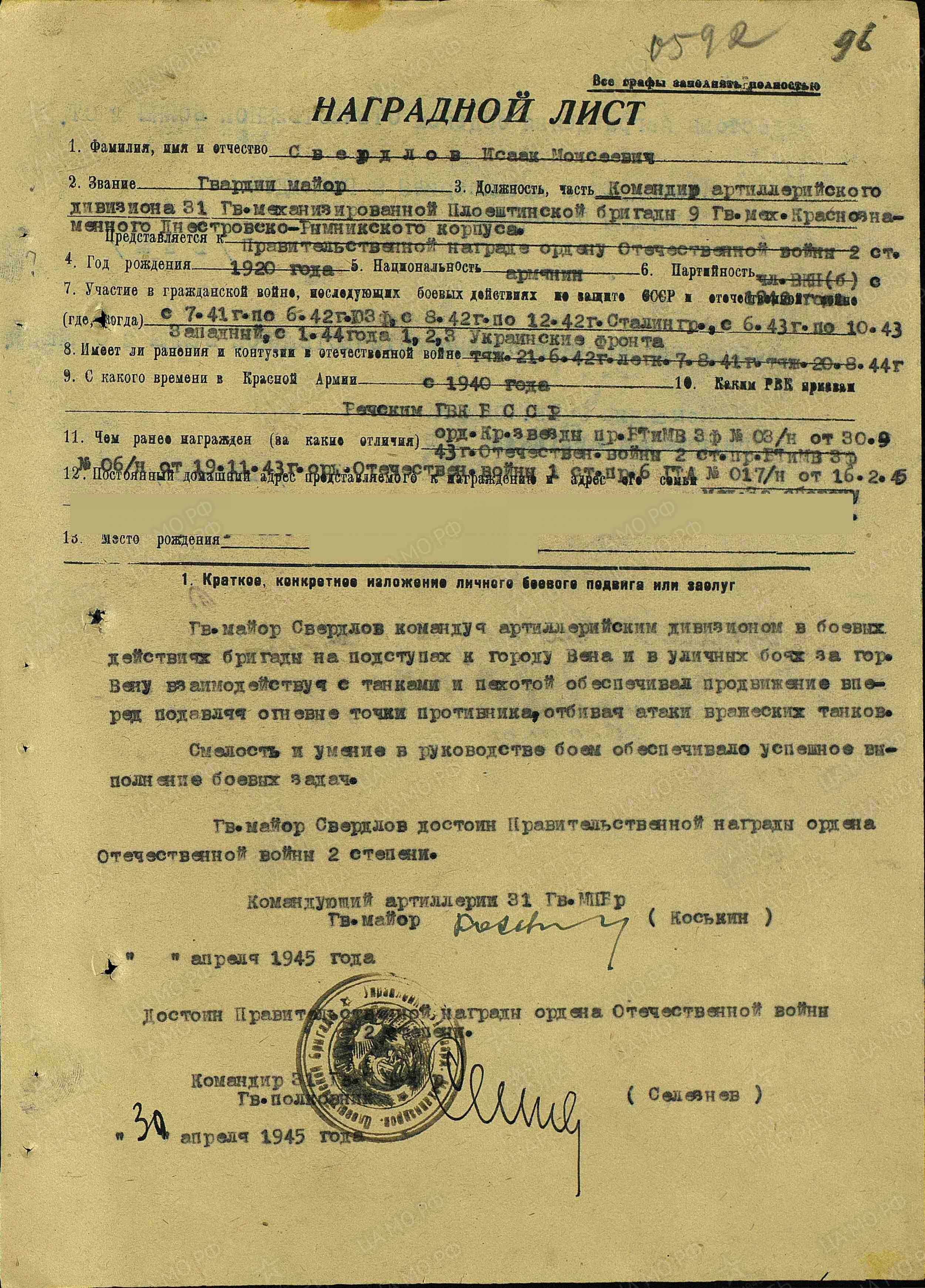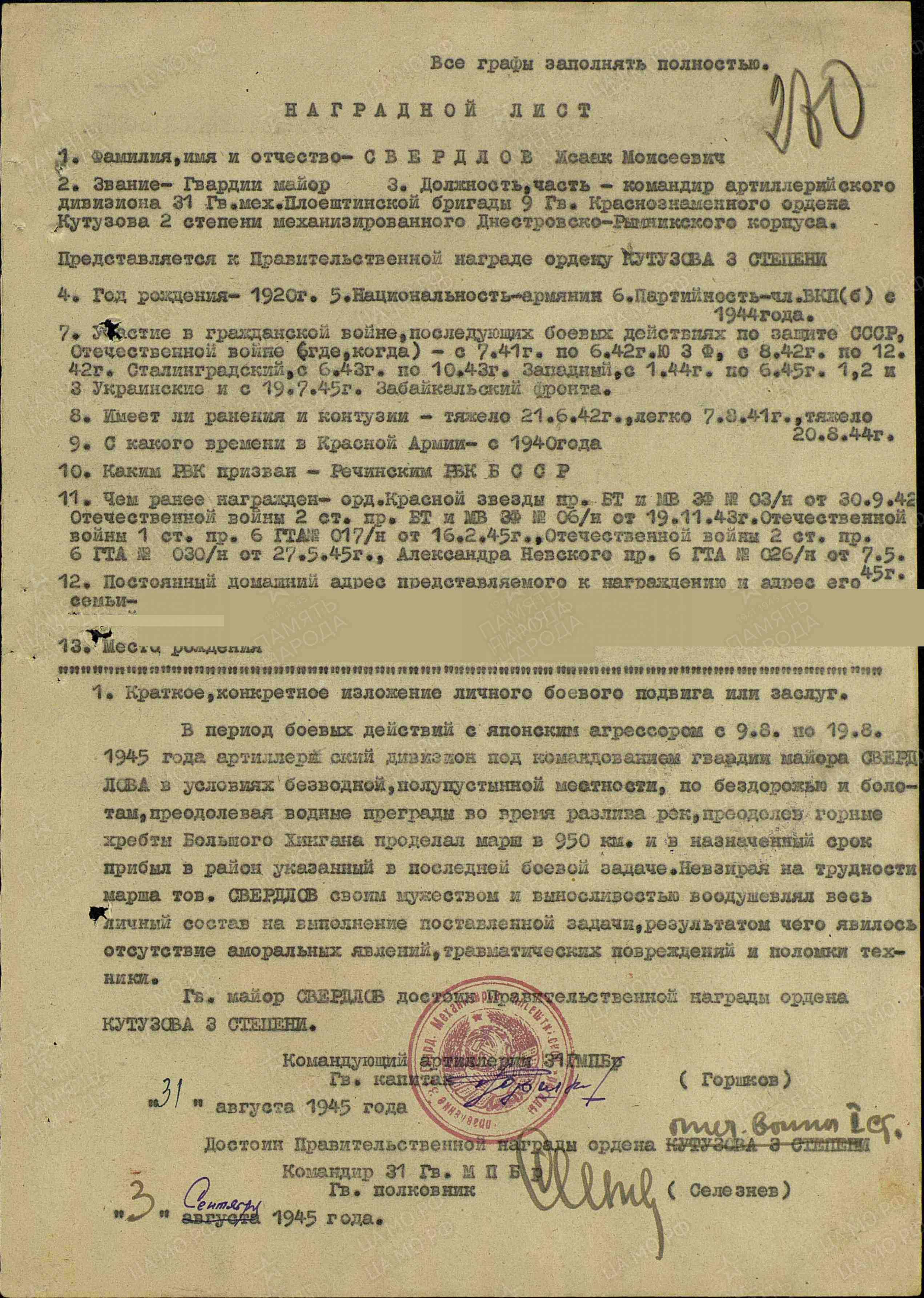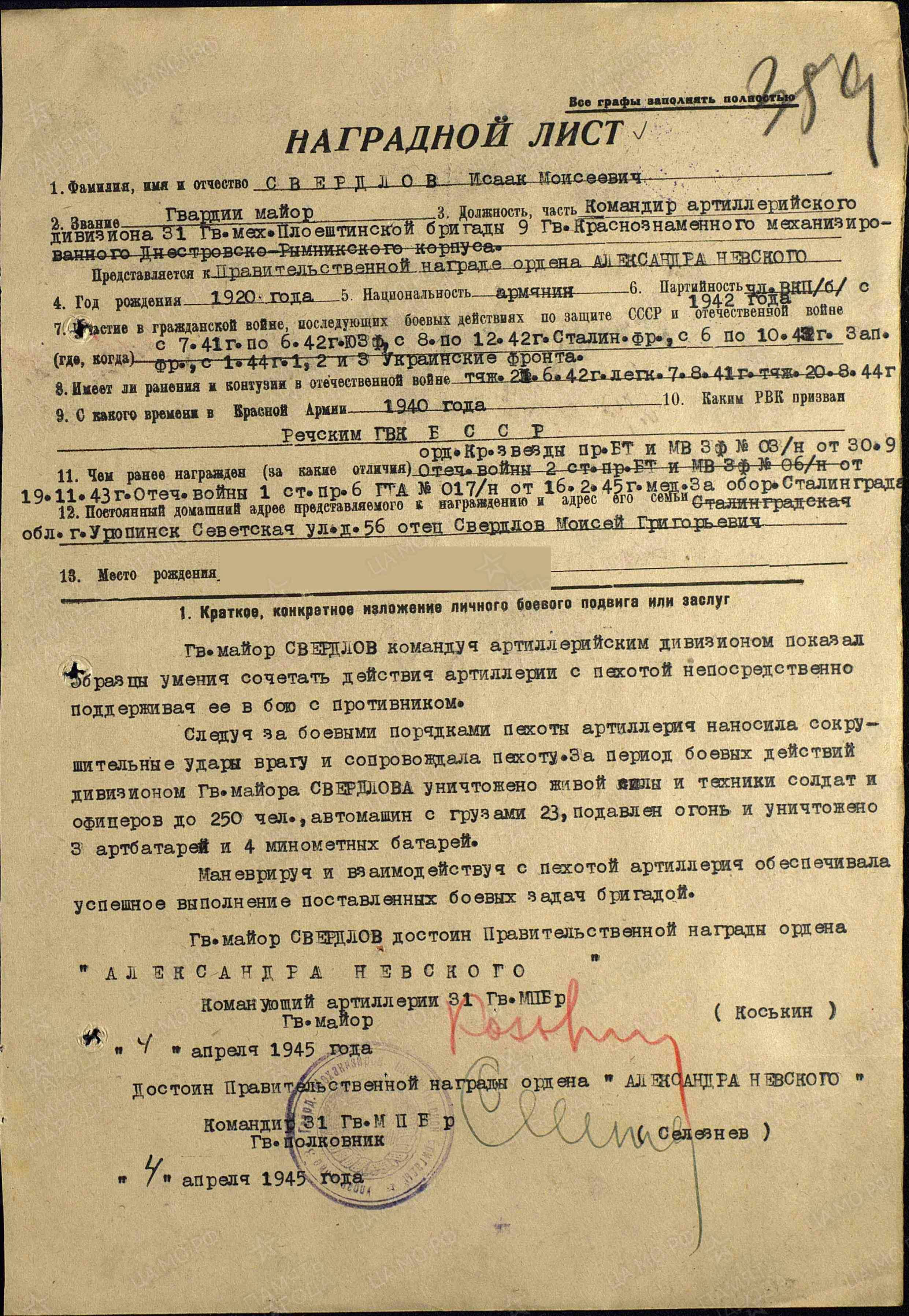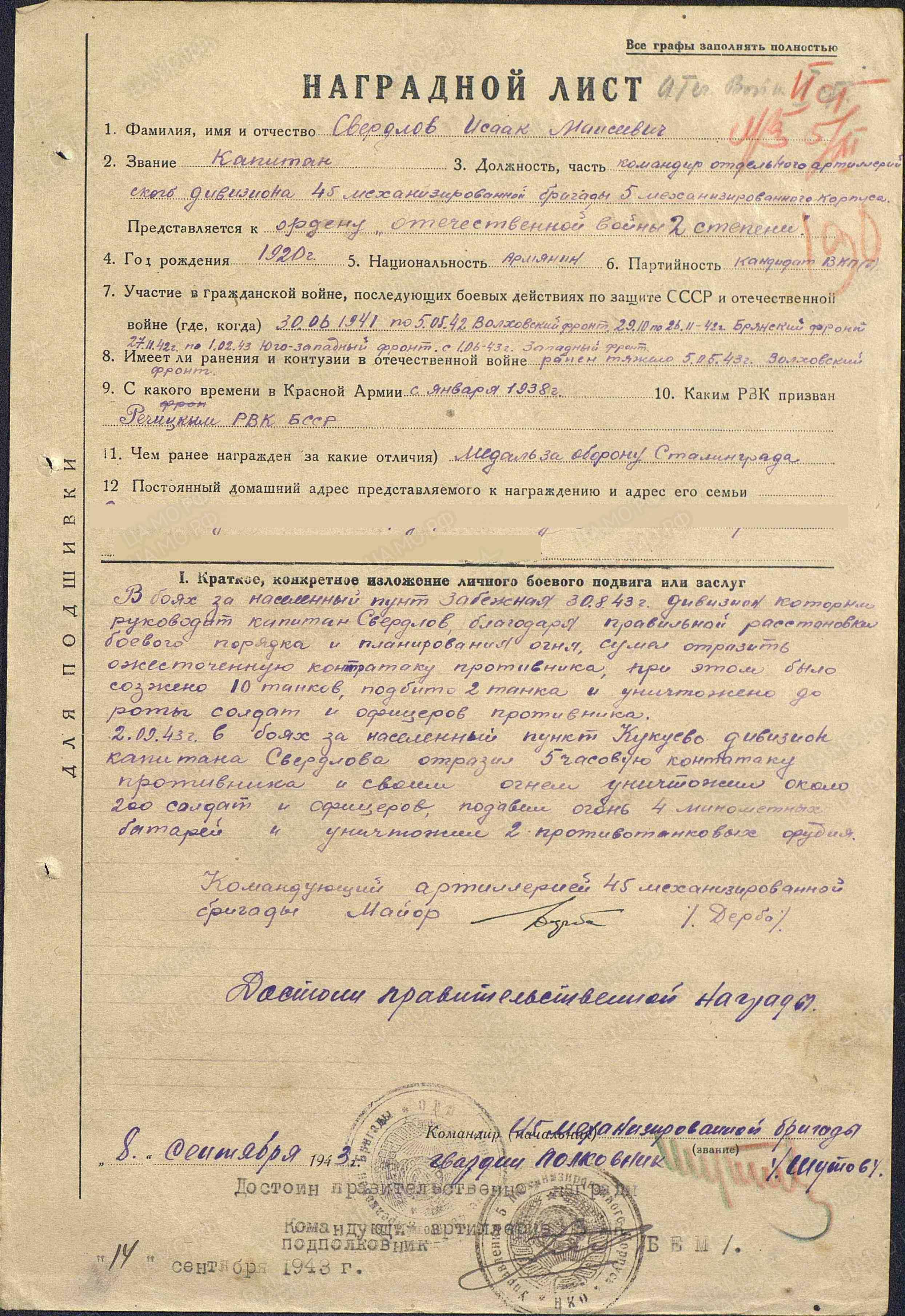 Гвардии подполковник СВЕРДЛОВ ИСААК МОИСЕЕВИЧ, 13.01.1920 года рождения, место рождения - Белорусская ССР, Гомельская область, Речицкий район, г. Речица, еврей. В РККА призван Речицким ГВК, Речицкого района, в 1940 году. В Великой Отечественной войне с 1941 года (на Западном, Юго - Западном, Брянском, Сталинградском, 1, 2, 3 Украинских фронтах), в должности: Командир артиллерийского дивизиона 31 гвардейской механизированной Плоештинско - Порт-Артурской ордена Богдана Хмельницкого бригады, 9 гвардейского механизированного Днепровско - Рымниковского Краснознамённого корпуса, 6 гвардейской танковой армии, 2 Украинского фронта. Боевые награды: 1. Ордена: "ОТЕЧЕСТВЕННОЙ ВОЙНЫ" 1 (2)  и 2 (2) СТЕПЕНЕЙ,  "АЛЕКСАНДРА НЕВСКОГО", "КРАСНОЙ ЗВЕЗДЫ"; 2. Медали: "ЗА БОЕВЫЕ ЗАСЛУГИ", "ЗА ОБОРОНУ СТАЛИНГРАДА", "ЗА ВЗЯТИЕ БУДАПЕШТА", "ЗА ВЗЯТИЕ ВЕНЫ", "ЗА ОСВОБОЖДЕНИЕ ПРАГИ", "ЗА ПОБЕДУ НАД ЯПОНИЕЙ", "ЗА ПОБЕДУ НАД ГЕРМАНИЕЙ В ВЕЛИКОЙ ОТЕЧЕСТВЕННОЙ ВОЙНЕ 1941 - 1945 ГГ."  с ЭЛЕКТРОННЫЙ БАНК ДОКУМЕНТОВ «ПОДВИГ НАРОДА В ВЕЛИКОЙ ОТЕЧЕСТВЕННОЙ ВОЙНЕ 1941-1945 ГГ.» http://podvignaroda.ru/?#tab=navHome    После победы на Германией, часть и соединение передислоцированы на войну с Японией. Вернулся с Великой Отечественной и советско - японской войн. Послевоенная судьба: неизвестна. Умер в 1988 году, в годе Минске, Белорусской ССР. Захоронен: г. Минск. Вечная Память и Слава!