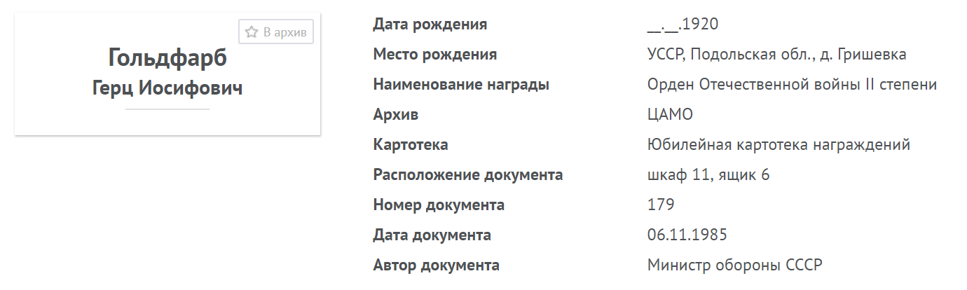 Гвардии ефрейтор ГОЛЬДФАРБ ГЕРЦ ИОСИФОВИЧ, 1920 года рождения, место рождения - Украинская ССР, Каменец - Подольская область, Изяславский район, еврей. В РККА призван Изяславским РВК, Изяславского района, Каменец - Подольской области, Украинской ССР, в 1940 году. В Великой Отечественной войне с 22.06.1941 года (на Западном, Юго - Западном, Воронежском, 1 Украинском фронтах) в должности: Наводчика пулемета ДШК 2 батареи 177 гвардейского артиллерийско - миномётного дважды Краснознамённого ордена Богдана Хмельницкого полка, 2 гвардейской кавалерийской Крымской ордена Ленина дважды Краснознамённой ордена Богдана Хмельницкого дивизии имени СНК УССР, 1 гвардейского кавалерийского Житомирского Краснознамённого корпуса имени СНК Ураинской ССР, 1 Украинского фронта. Ранения: 1. Лёгкое (в 1942 году). Боевые награды: 1. Ордена: "ОТЕЧЕСТВЕННОЙ ВОЙНЫ" 2 СТЕПЕНИ, "КРАСНОЙ ЗВЕЗДЫ", "СЛАВЫ" 2 СТЕПЕНИ (2; Из НАГРАДНОГО ЛИСТА на Орден "СЛАВЫ" 2 СТЕПЕНИ: