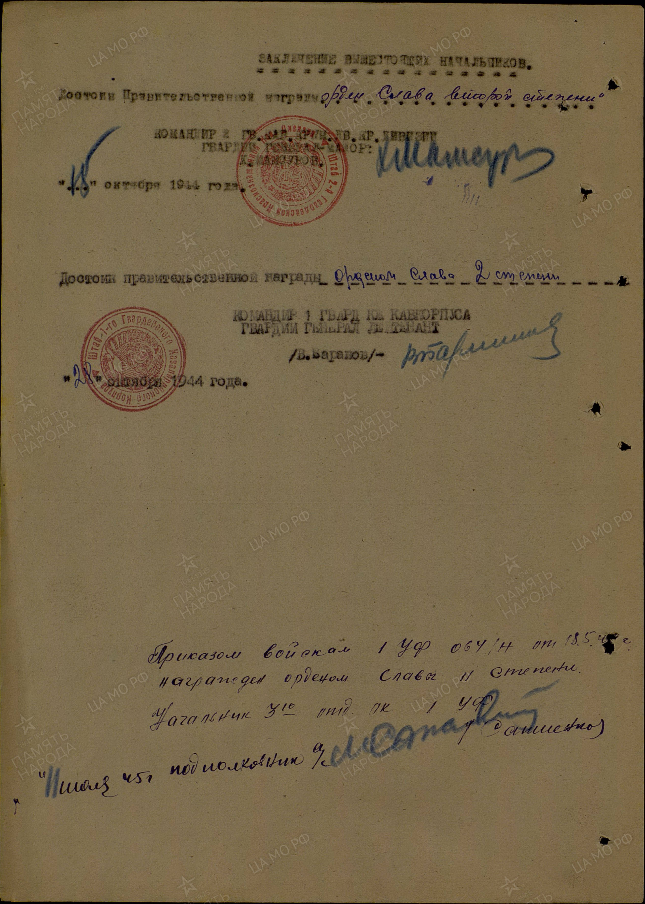Командир 1 гв. Кавкорпуса Гвардии генерал - лейтенант БАРАНОВ. 28.10.1944 года.".
