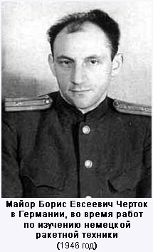 В апреле 1945 года в составе специальной комиссии Б.Е.Черток был командирован в Германию, где до января 1947 года руководил работой группы советских специалистов по изучению ракетной техники. 2 мая 1945 года в звании майора он расписался на Рейхстаге, что считал счастливейшим достижением в своей жизни. В том же году вместе с А.М.Исаевым он организовал в советской оккупационной зоне (в Тюрингии) совместный советско-германский ракетный институт «Рабе», который занимался изучением и развитием техники управления баллистическими ракетами дальнего действия. На базе института в 1946 году был создан новый институт – «Нордхаузен», главным инженером которого был назначен С.П.Королёв. С этого времени Б.Е.Черток работал в тесном сотрудничестве в С.П.Королёвым.