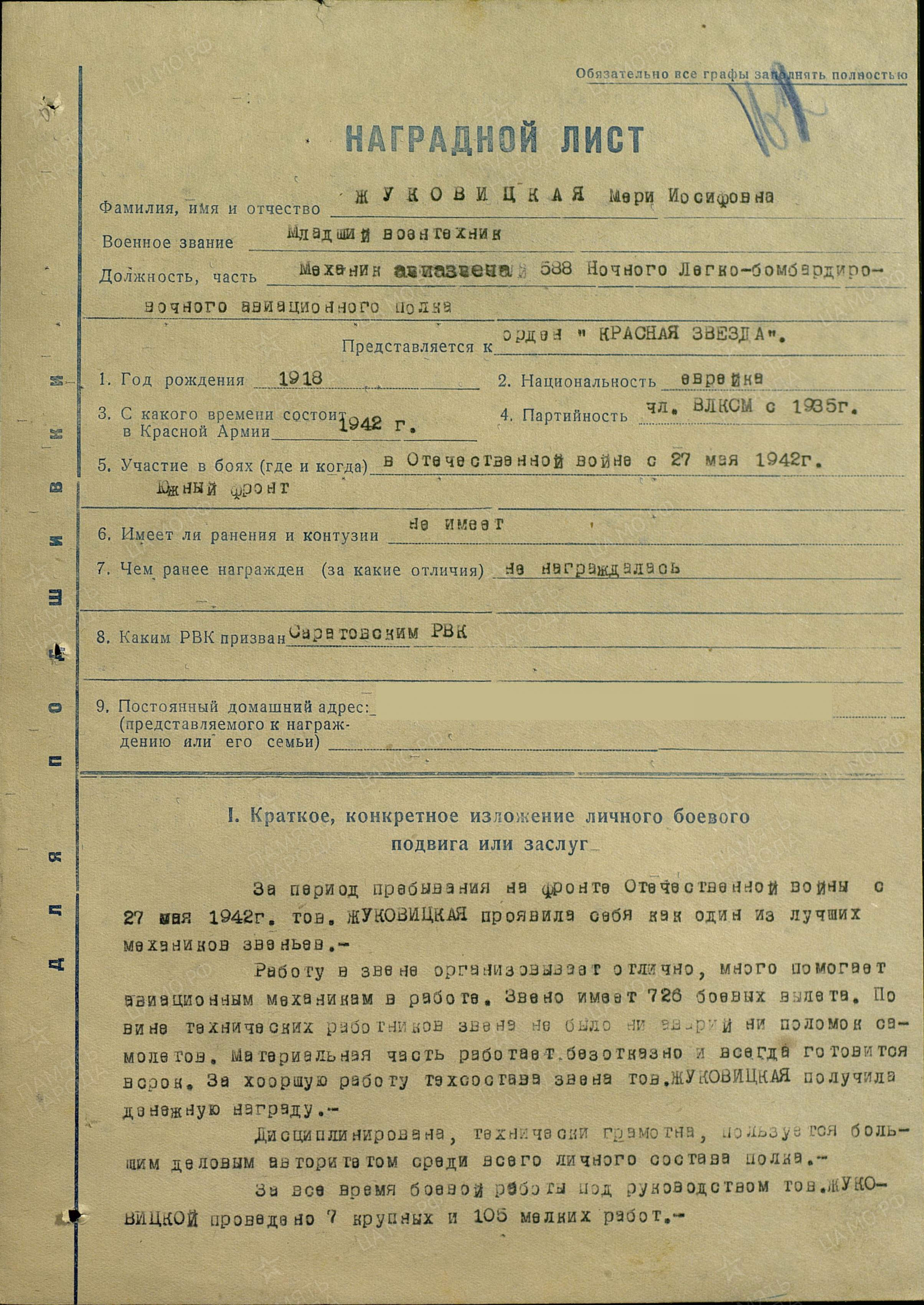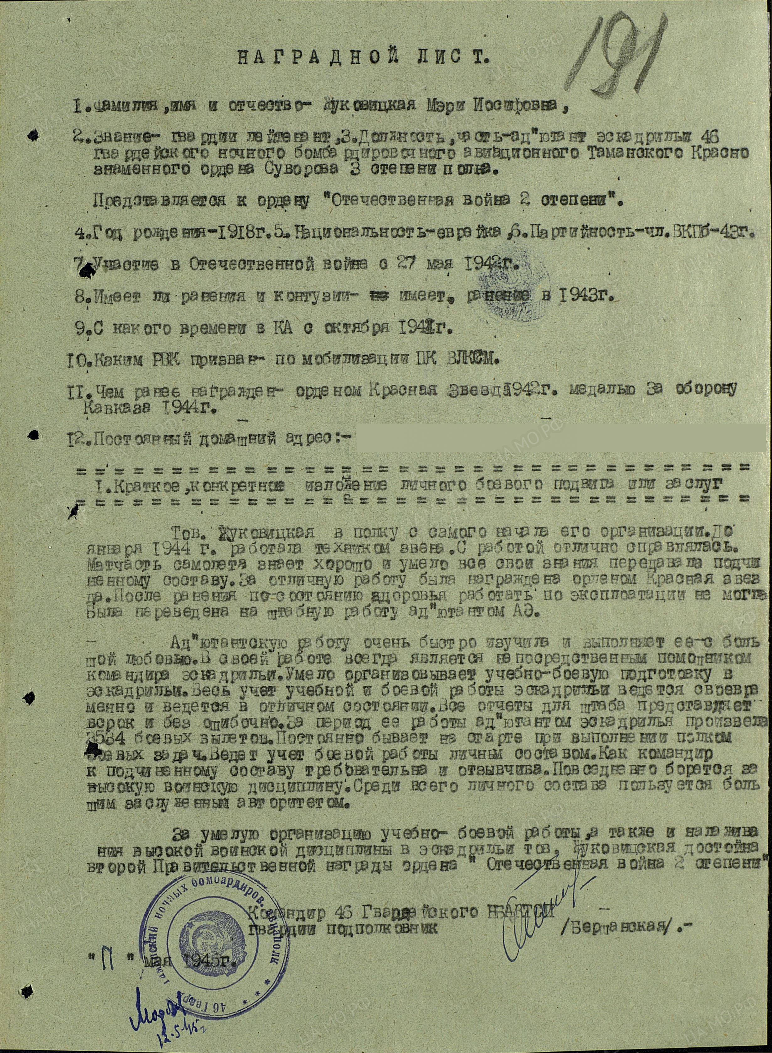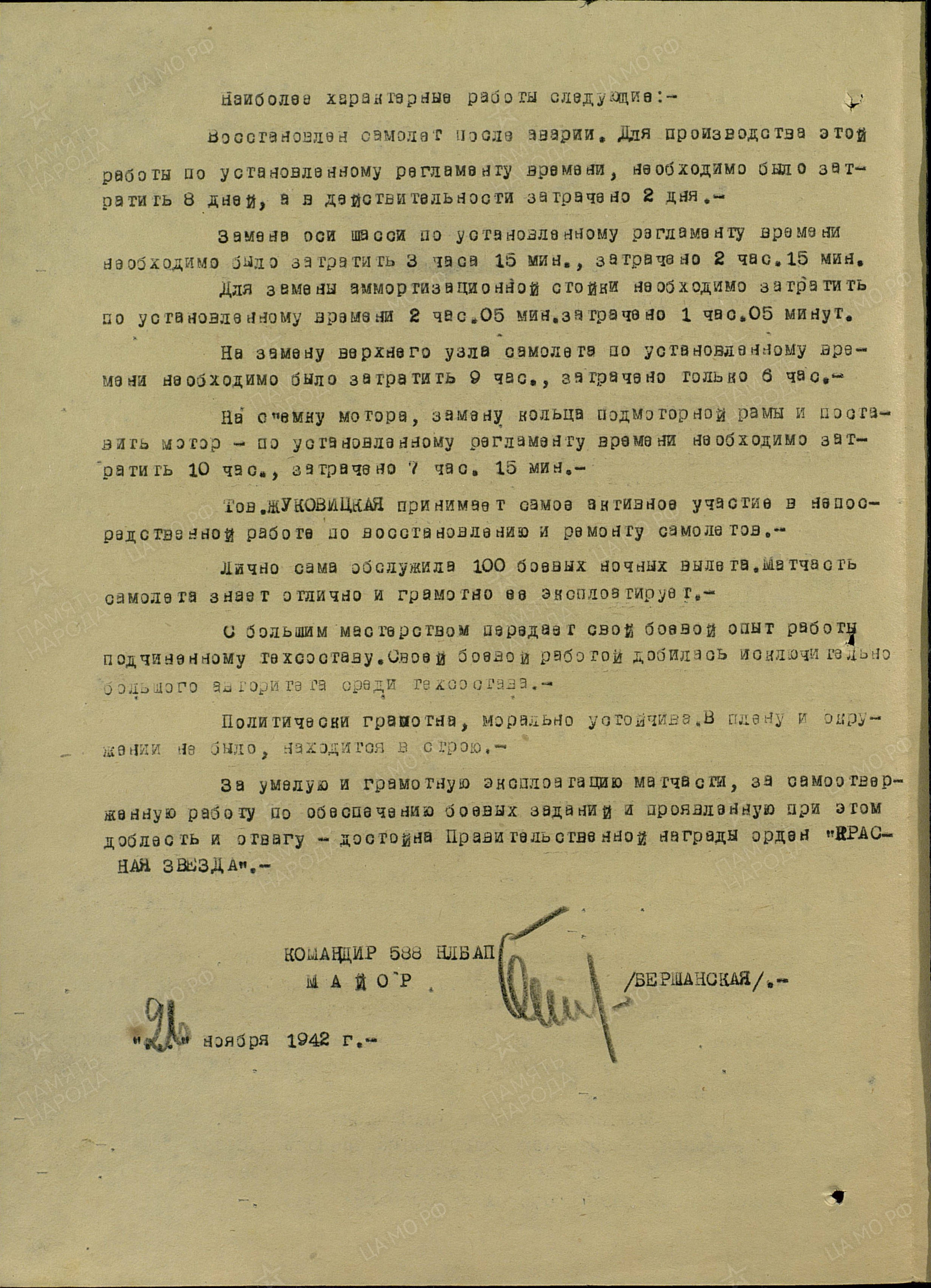 Жуковицкую назначили адъютантом (начальником штаба) эскадрильи, которой мне довелось командовать. Мери была мне хорошим помощником и товарищем. Кропотливую работу над бумагами, которую мы считали скучной, Жуковицкая выполняла не только добросовестно и аккуратно, но и с большим желанием, как, впрочем, все, что ей поручалось. Она ежедневно заполняла летные книжки, писала донесения в штаб полка о полетах за каждую боевую ночь, помогала оформлять наградные листы на личный состав эскадрильи, часто дежурила на старте и записывала в журнал доклады о выполнении экипажами заданий.