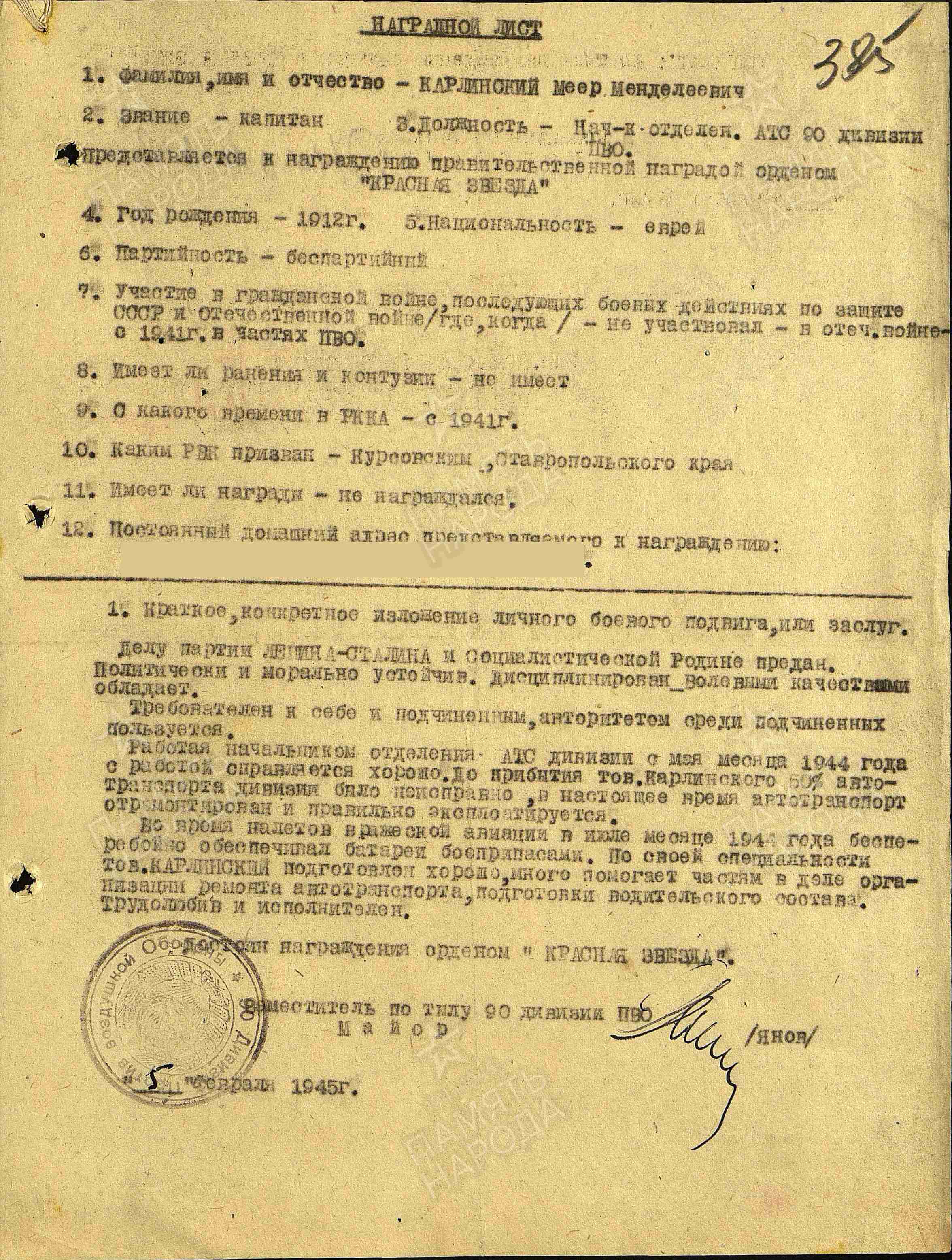Карлинский Меер Менделевич родился 26 Апреля 1912 года в Тбилиси. Закончил Ленинградский Политехнический Институт в 1936 году. На фронте с первых дней войны. В 1941 году отступал со своей частью до Москвы. Участвовал в обороне Москвы, Битве на Курской Дуге. Закончил войну в Германии. После войны жил в Ленинграде, работал инженером. В 1992 эмигрировал в США. Скончался в 1998 году.
