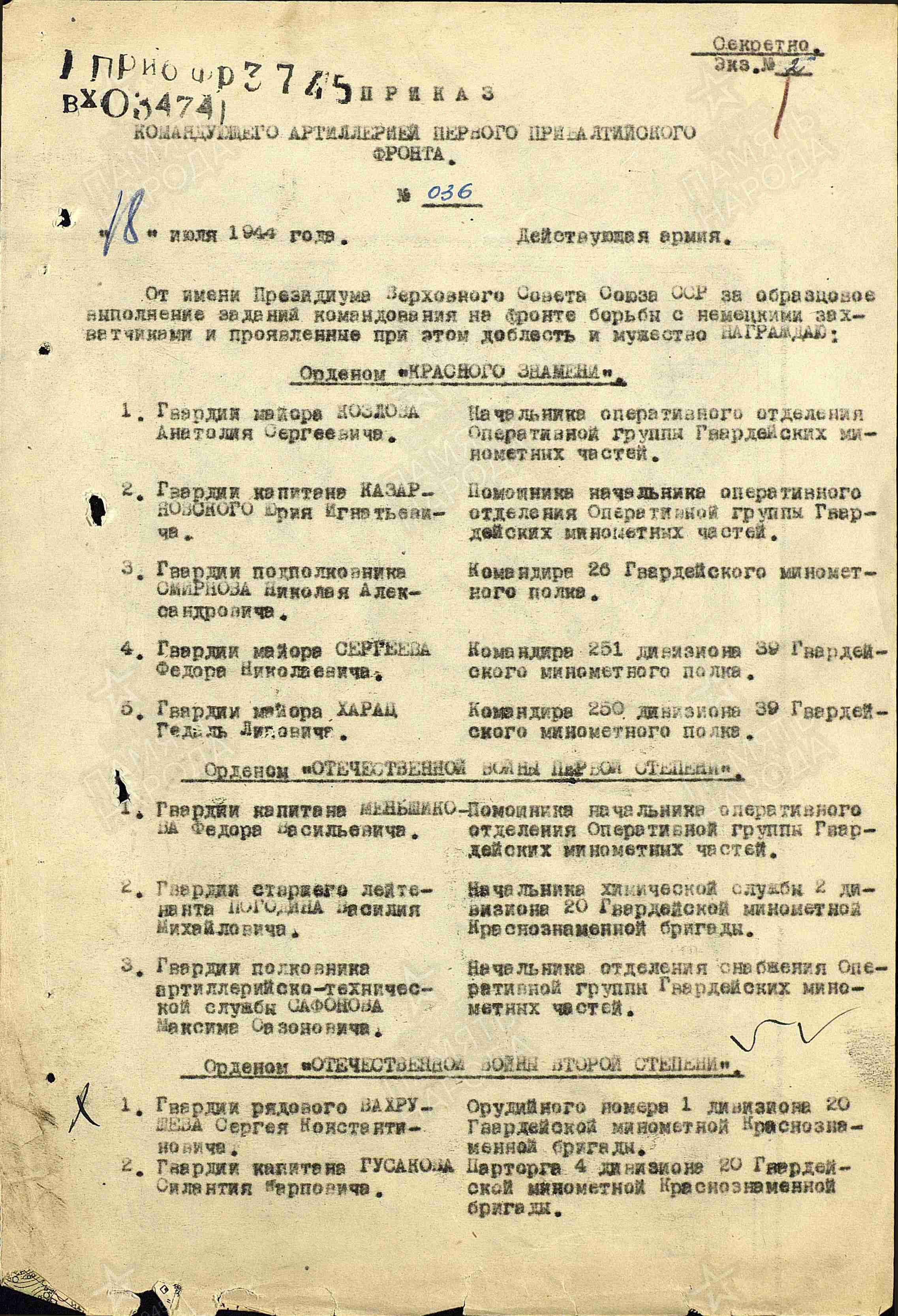 ЛИЧНАЯ СТРАНИЦА  на гвардии подполковника ХАРАЦА Г. Л.: