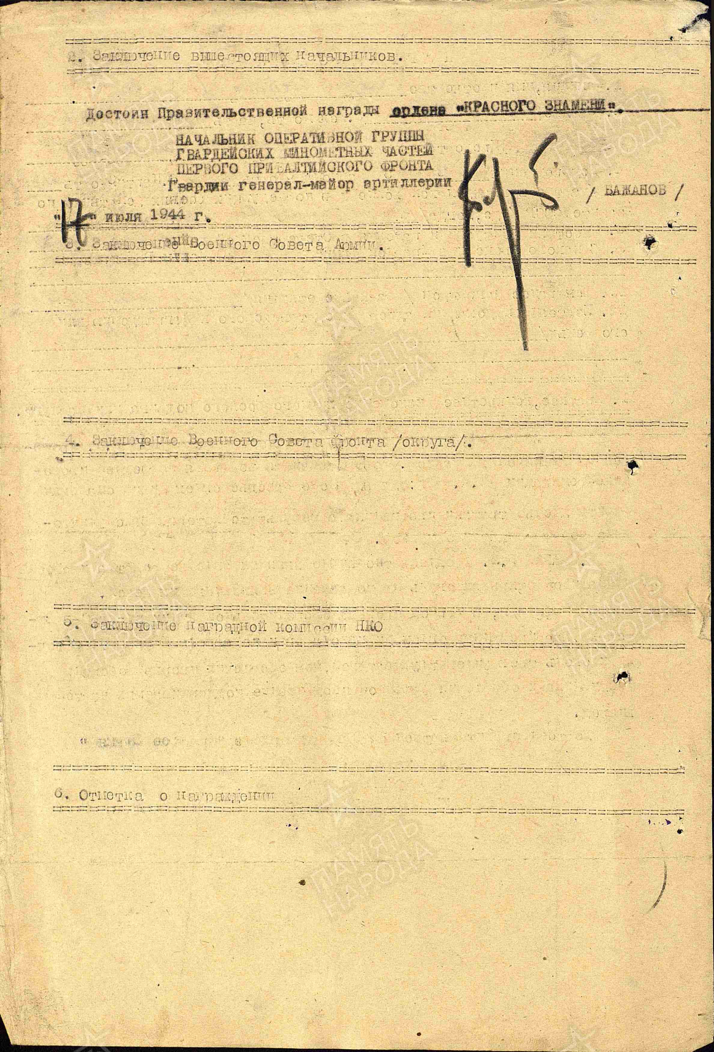 Командир 250 гвардейского миномётного дивизиона, 39 гвардейского миномётного ордена Красной Звезды полка, Оперативной группы гвардейских миномётных частей 1 Прибалтийского фронта (1944).