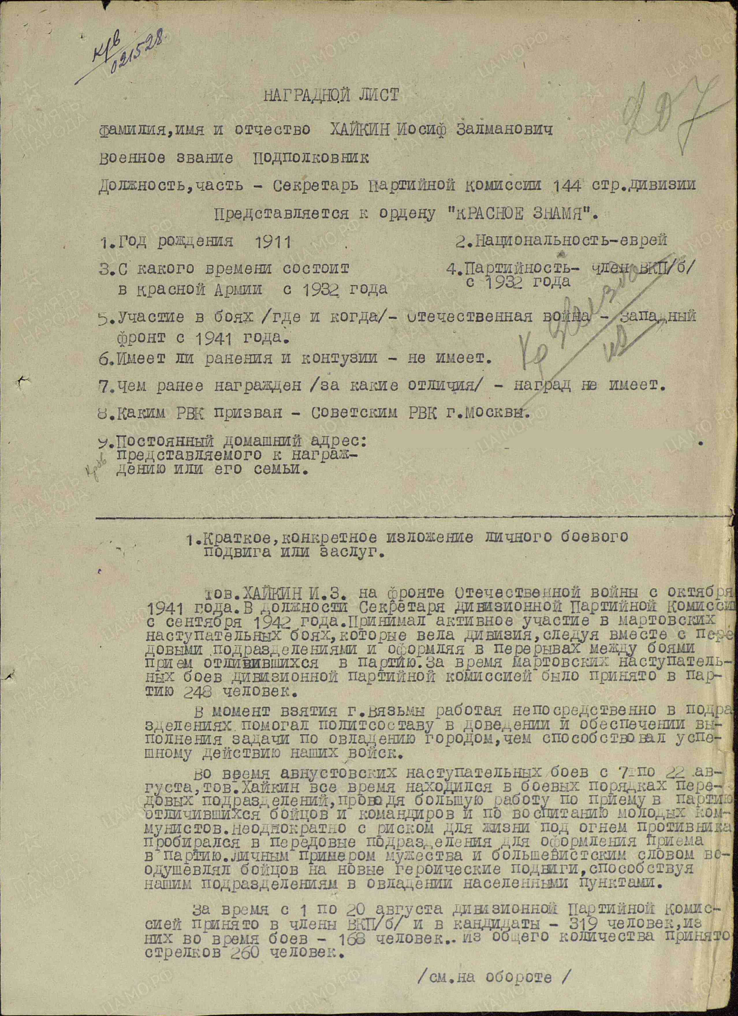 Подполковник ХАЙКИН ИОСИФ ЗАЛМАНОВИЧ, 1911 года рождения, место рождения -  Российская Империя, Могилёвская губерния, Гомельский уезд, Чечерская волость, г. Чечерск (по административному делению СССР: Белорусская ССР, Гомельская область, Чечерский район, г. Чечерск), еврей. В РККА призван Советским РВК, Советского района, г. Москвы, Московской области, РСФСР, в 1932 году. Кадровый офицер - политработник. В Великой Отечественной войне с 06.1941 года (на Западном фронте), в должности (последняя): Секретаря партийной комиссии 144 стрелковой дивизии, 33 армии, Западного фронта. Ранения: нет. Боевые награды: Орден "КРАСНАЯ ЗВЕЗДА" (№ записи 20211106; НАГРАДНОЙ ЛИСТ на орден "КРАСНОЕ ЗНАМЯ") с ЭЛЕКТРОННЫЙ БАНК ДОКУМЕНТОВ «ПОДВИГ НАРОДА В ВЕЛИКОЙ ОТЕЧЕСТВЕННОЙ ВОЙНЕ 1941-1945 ГГ.» http://podvignaroda.ru/?#tab=navHome  С Великой Отечественной войны не вернулся: убит, в бою, 30.11.1943 года. Извещение: Московский ГВК, РСФСР, Московская область, г. Москва, 2-я Берсская, дом 43, кв. №65, родственники. Захоронен: РСФСР, Смоленская область, Краснинский район, п. Красный, братская могила №1 (предварительно); РОССИЯ, Смоленская область, Краснинский район, п.г.  Красный, мемориальный комплекс "ЗАЩИТНИКАМ ОТЕЧЕСТВА" (в настоящее время).  Вечная Слава и Память!