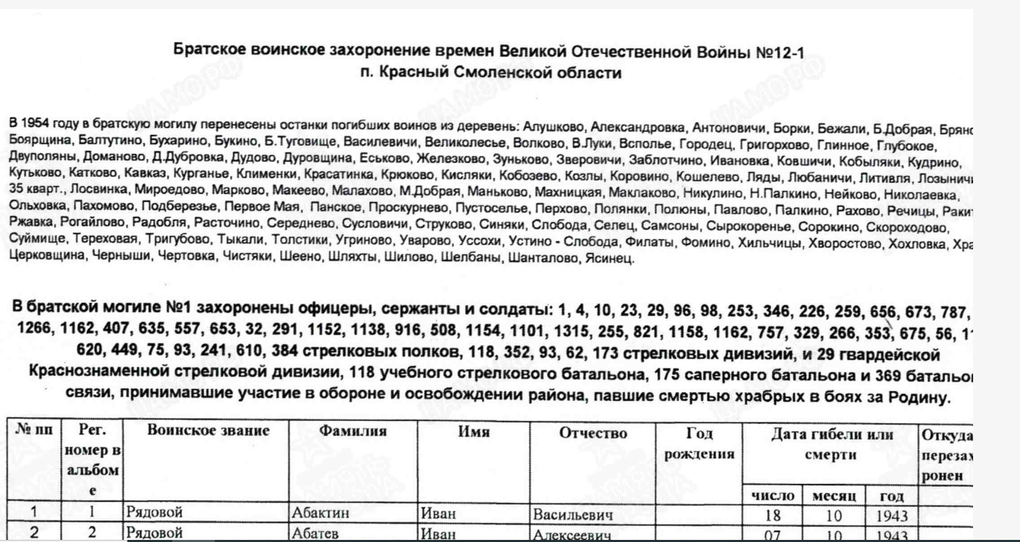 Первичное место захоронения Смоленская обл., Краснинский р-н, г. Красный