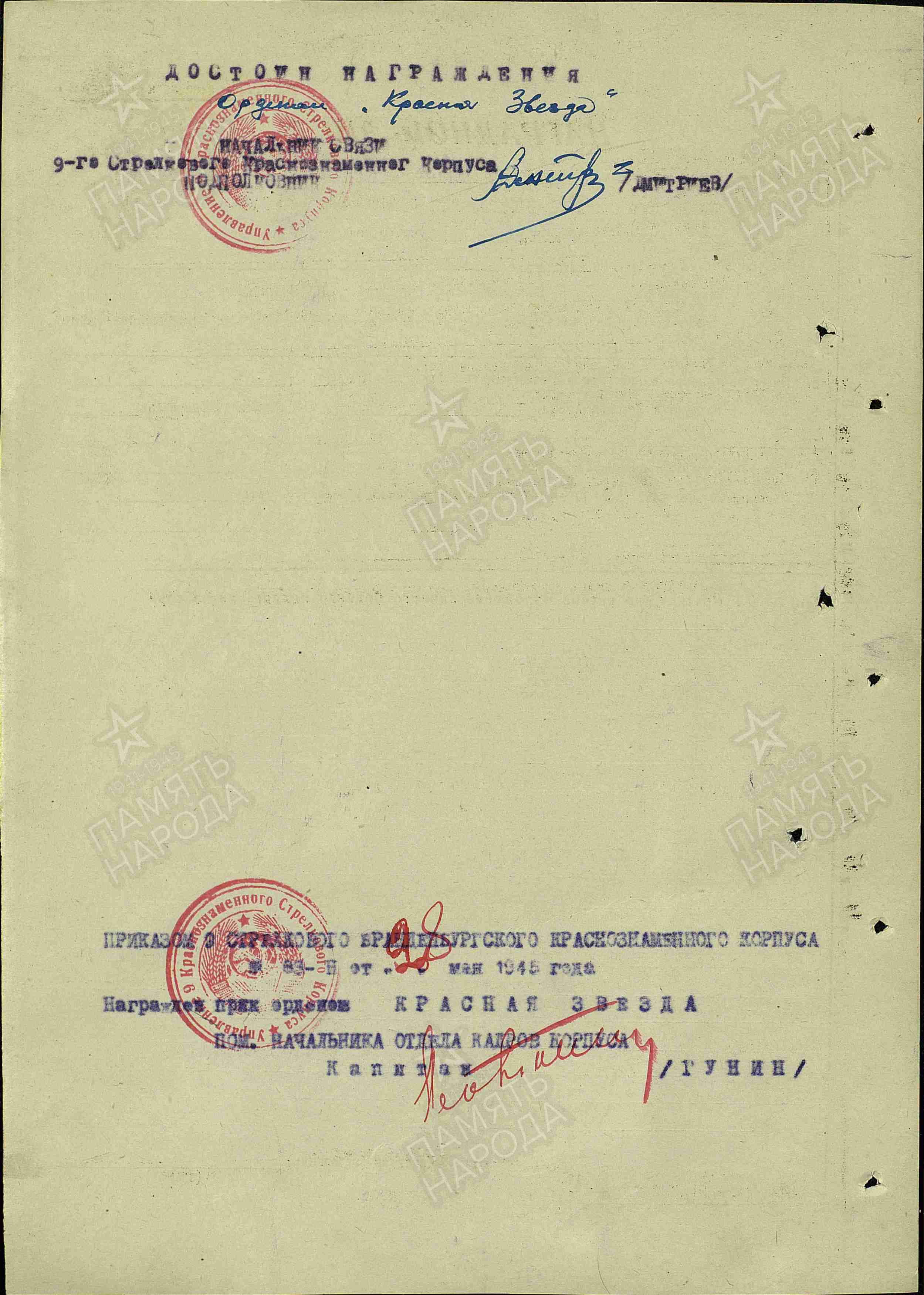 | 09.05.1945 | Медаль «За победу над Германией в Великой Отечественной войне 1941–1945 гг.» |