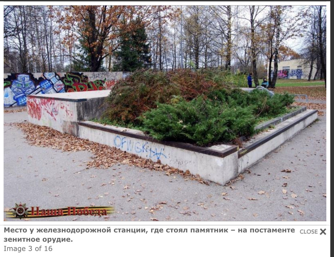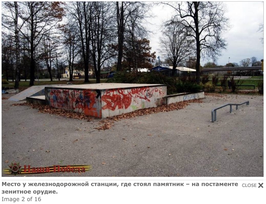 Погибших моряков-зенитчиков местные жители похоронили на месте боя. А позже могила была перенесена на слокское Лесное кладбище. В 1967 году у железнодорожной станции был открыт памятник – на постаменте замерло зенитное орудие. В 90-е годы памятник был перенесён на территорию севернее кладбища Слокас, где были похоронены погибшие воины. К месту, где первоначально стоял памятник, теперь примыкает площадка для катания на скейтбоарде. Стена, возле которой был установлен памятник, расписана граффити. Постамент, на котором стояло зенитное орудие, пуст и в плохом состоянии. Сведений о судьбе зенитного орудия нет.".