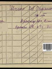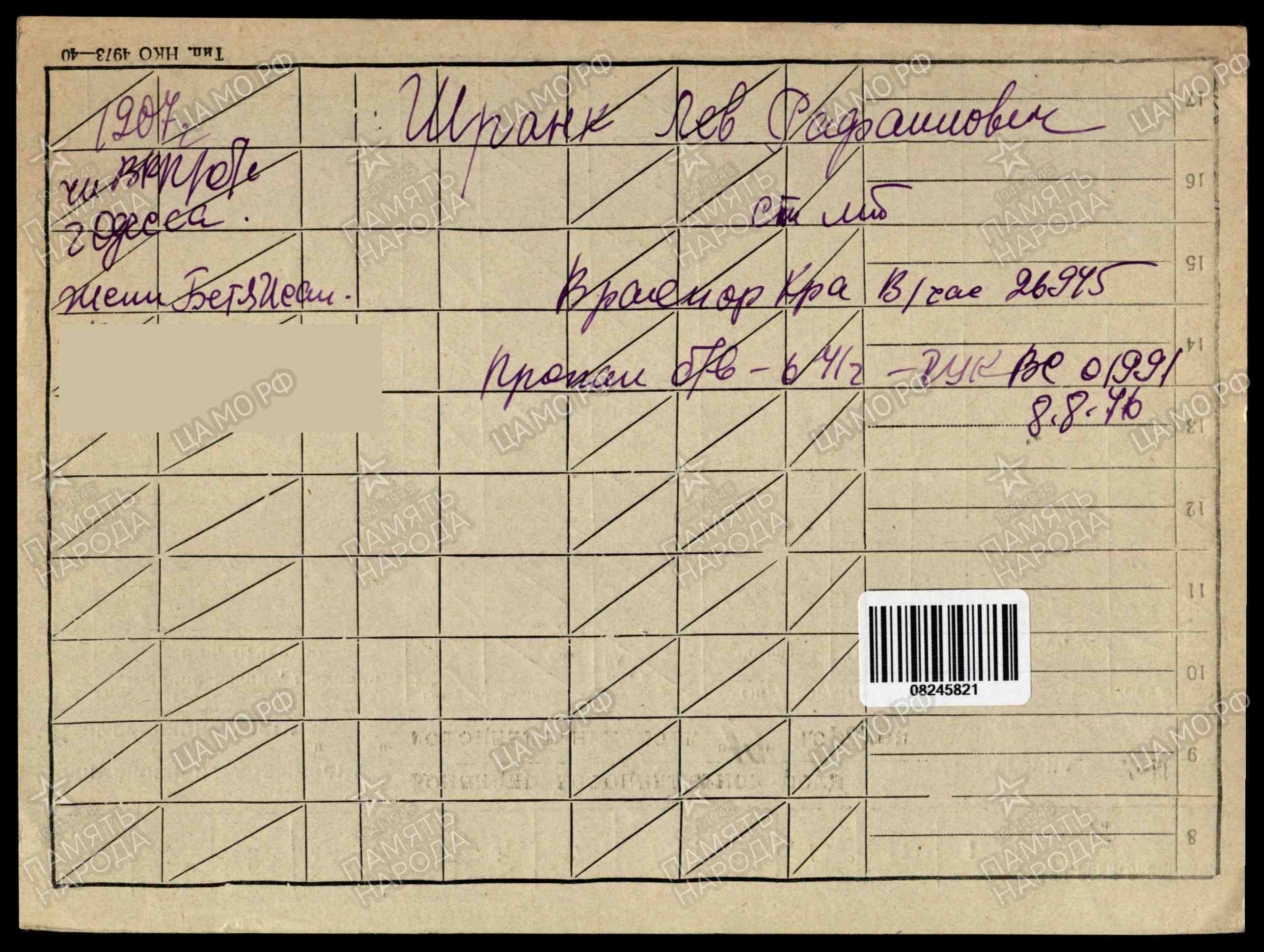 Старший лейтенант ШРАНК ЛЕВ РАФАИЛОВИЧ, 1907 года рождения, место рождения - РОССИЙСКАЯ ИМПЕРИЯ, Одесская губерния, губернский город Одесса (по административному делению: 1. СССР: Украинская ССР, Одесская область, г. Одесса; 2. Украины: Одесская область, г. Одесса), еврей. Год призыва на Краснознамённый Балтийский флот - неизвестен. В Великой Отечественной войне с 4.00 22.06.1941 года в должности (последняя): Командира 842 отдельной зенитной артиллерийской батареи, 84 отдельного зенитного артиллерийского дивизиона, Либавской Военно - морской базы, Краснознамённого Балтийского флота. Погиб 06.1941 года, защищая Либавскую (Лиепальскую) Военно - морскую базу. Захоронен: Латвийская Республика, город республиканского подчинения Юрмала, железнодорожная станция Слока, ул. Межмалас, воинское братское кладбище, захоронение воинов 84 отдельного зенитного артиллерийского дивизиона Либавской Военно - морской базы, Краснознамённого Балтийского флота. Родственники: Украинская ССР, г. Одесса, жена - Шранк Бетя Исааковна; Узбекская ССР, Бухарская область, г. Бухара, ул. Орджоникидзе, дом №14, жена - Шранк Бетя Исааковна.
