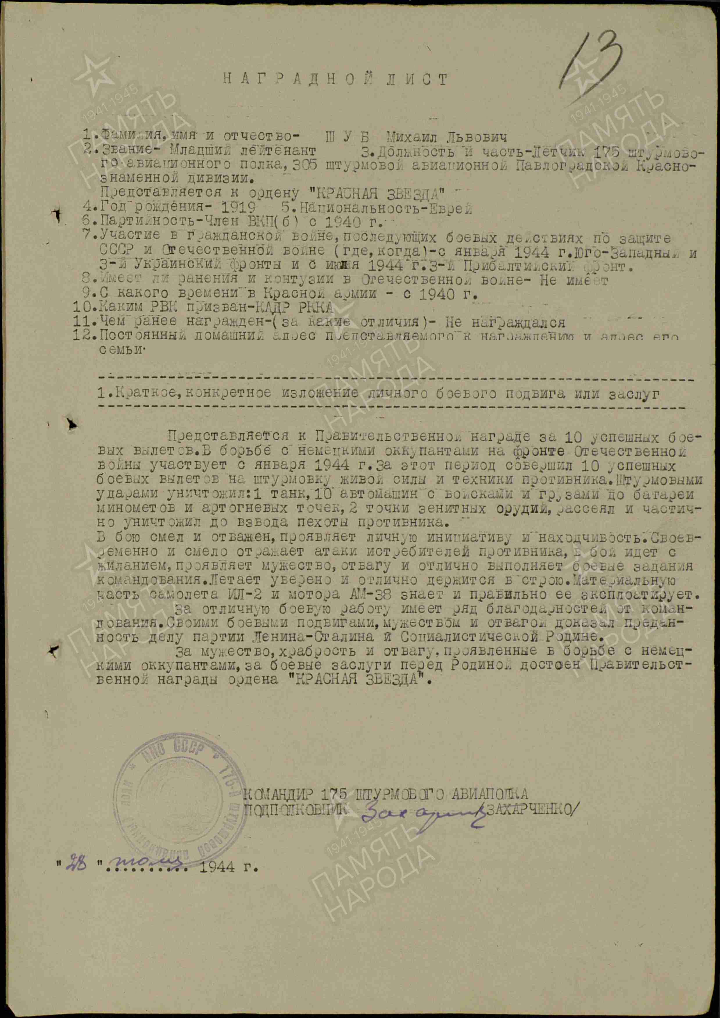 Михаил Львович Шуб родился 21.11.1919 в городе Харьков. Еврей.