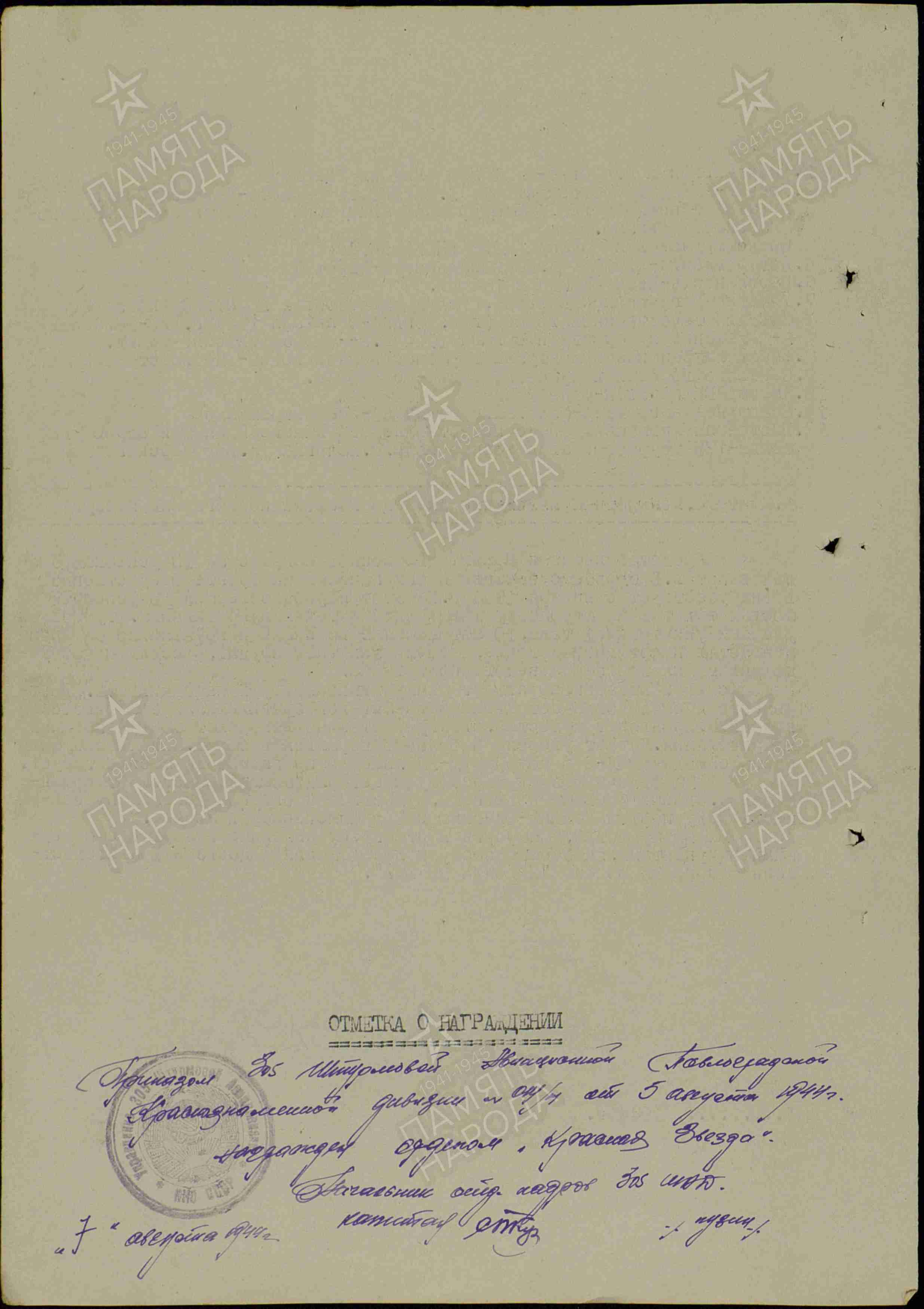 | 05.08.1944 | Орден Красной Звезды |