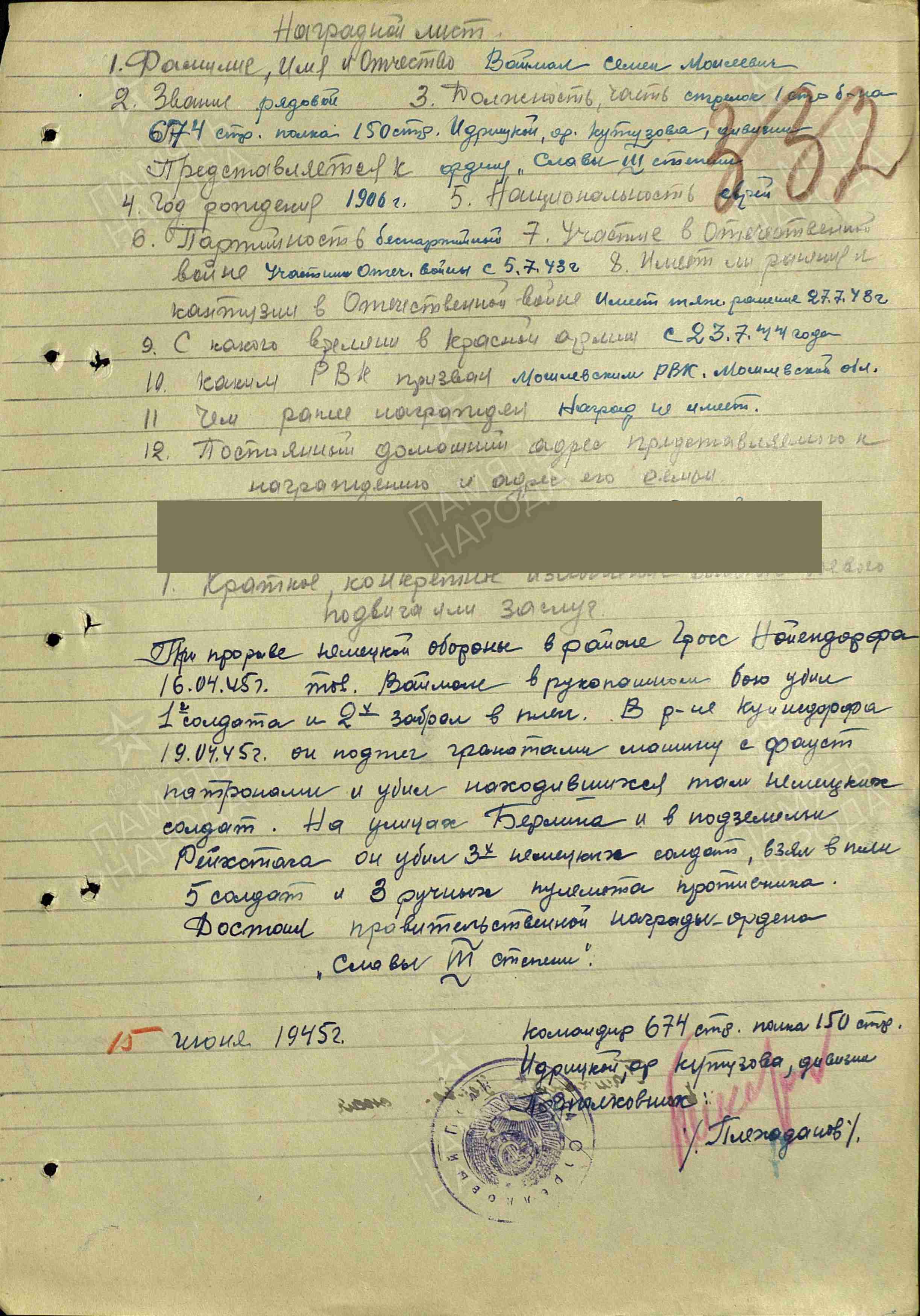 ЛИЧНАЯ СТРАНИЦА на красноармейца Вайнман (Вайман) С.М.: