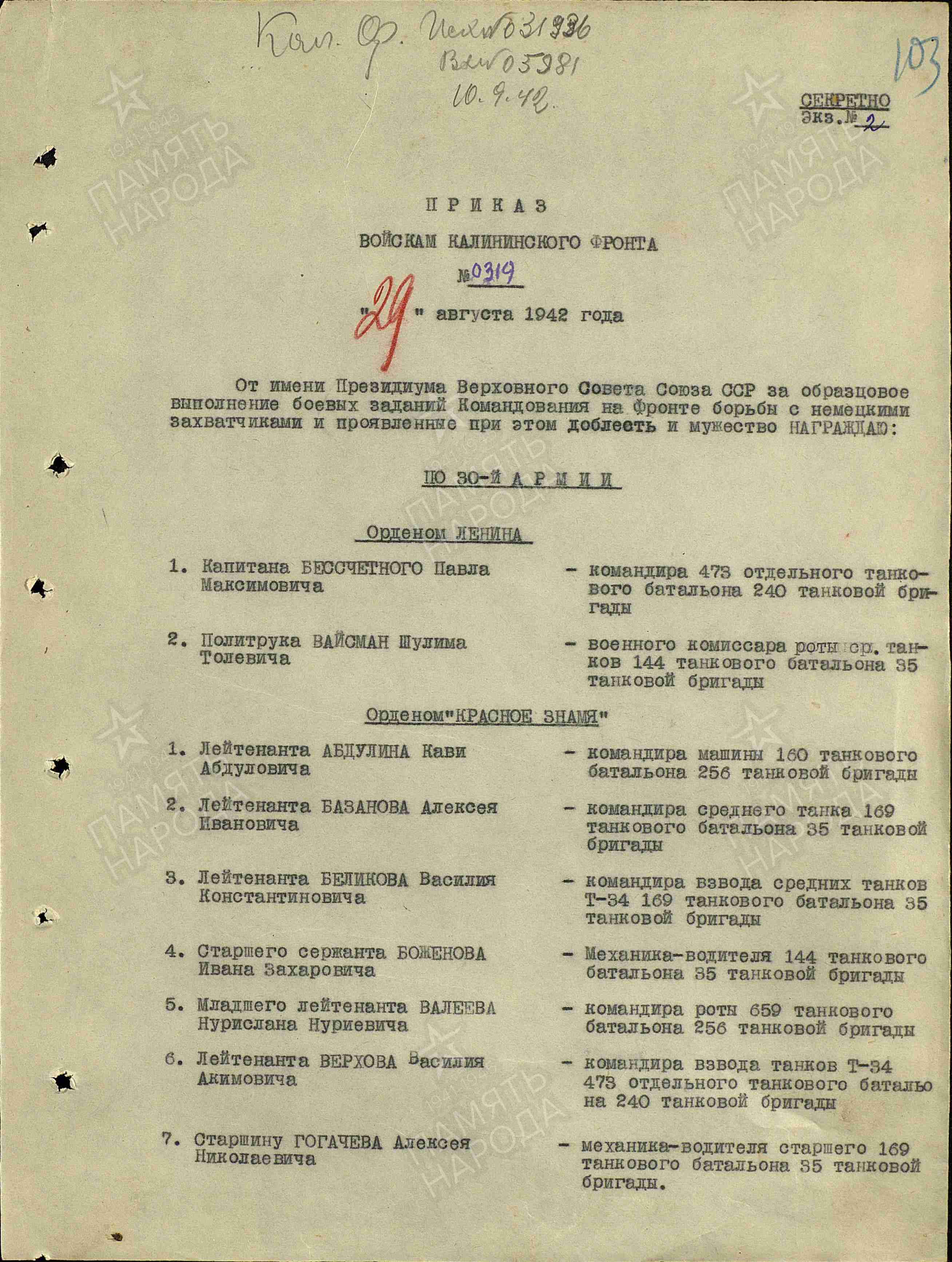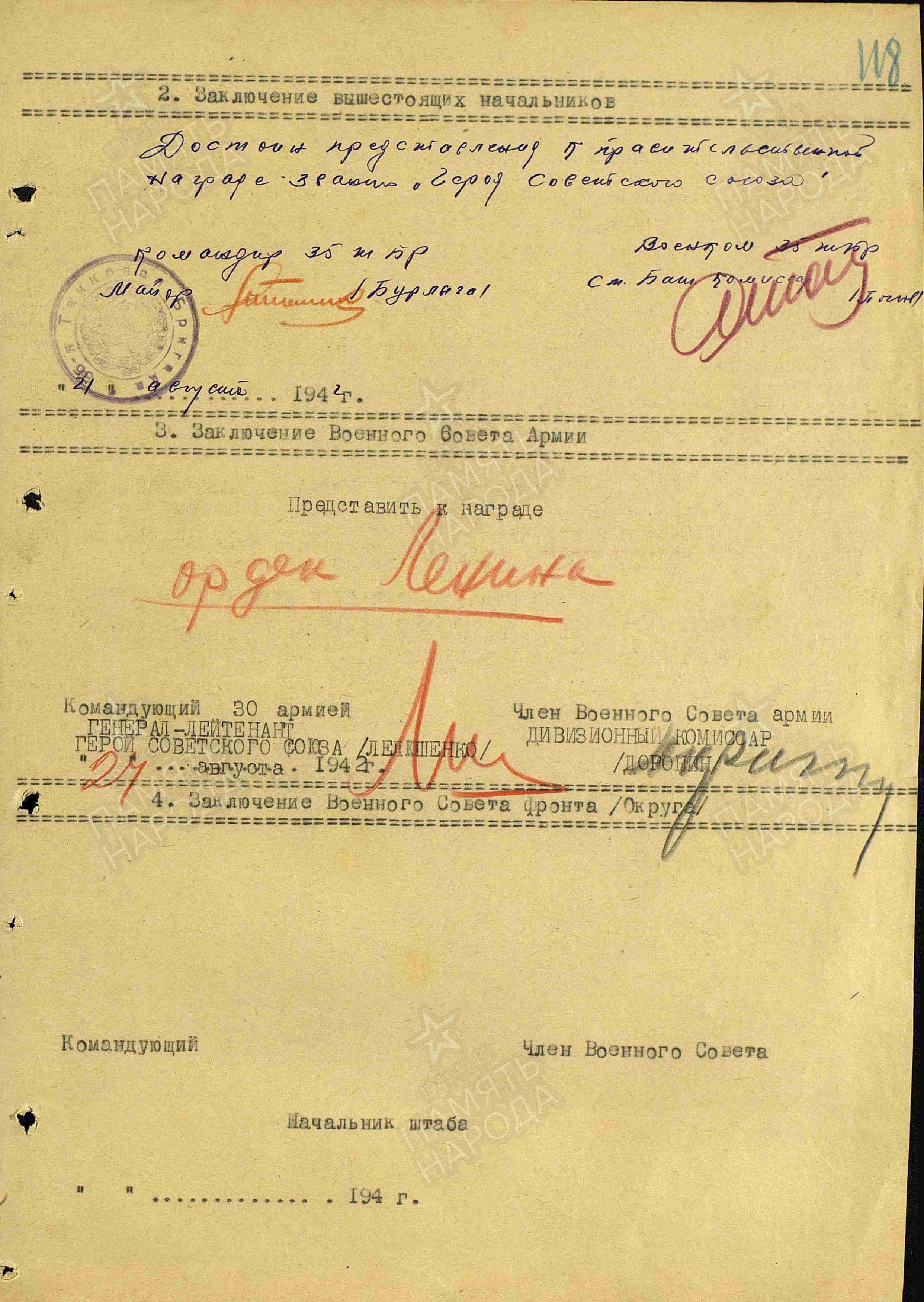 18.8.1942 за беспримерный героизм был представлен на звание Герой Советского Союза (посмертно), но по данному наградному листу был удостоен ордена Ленина.