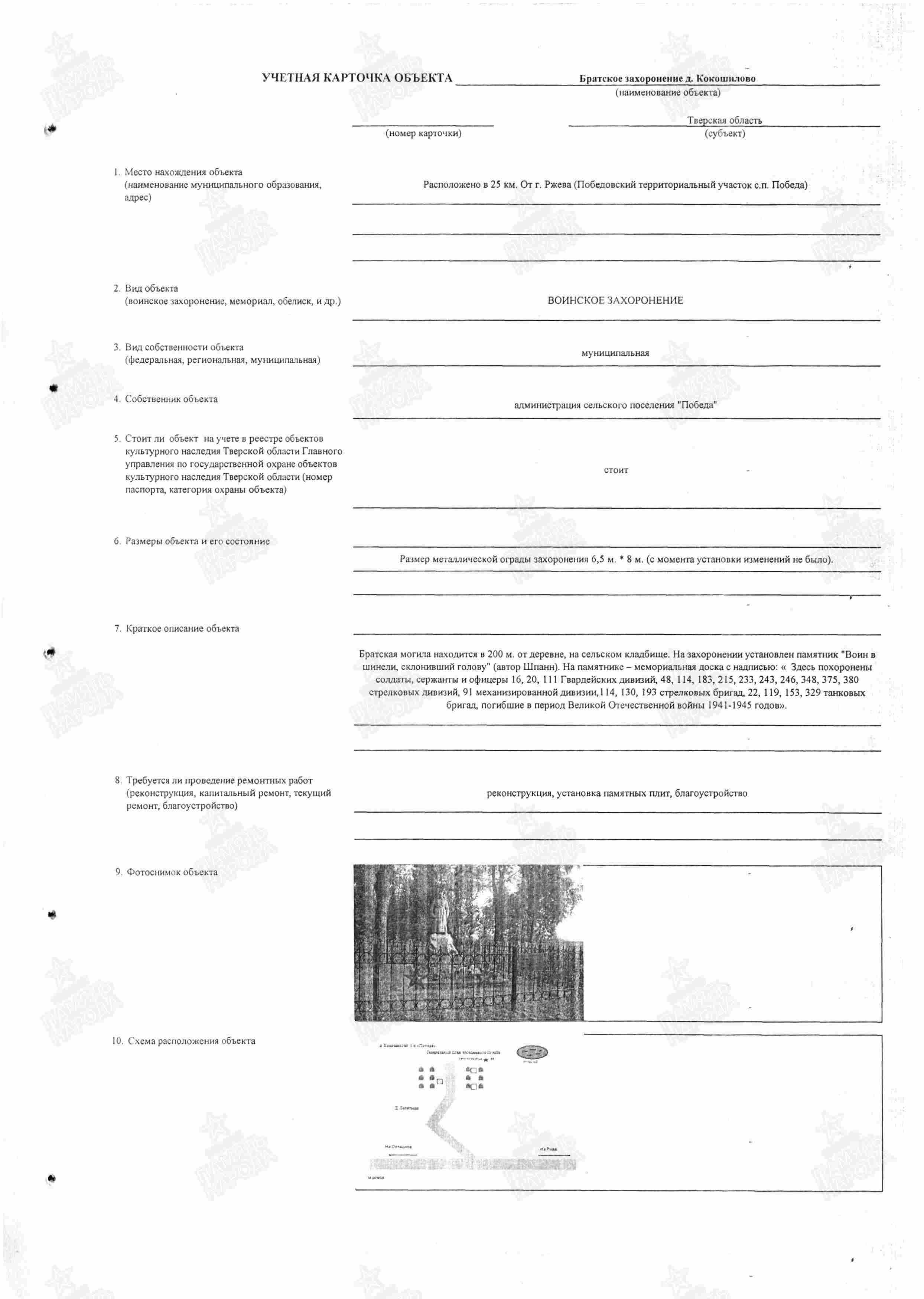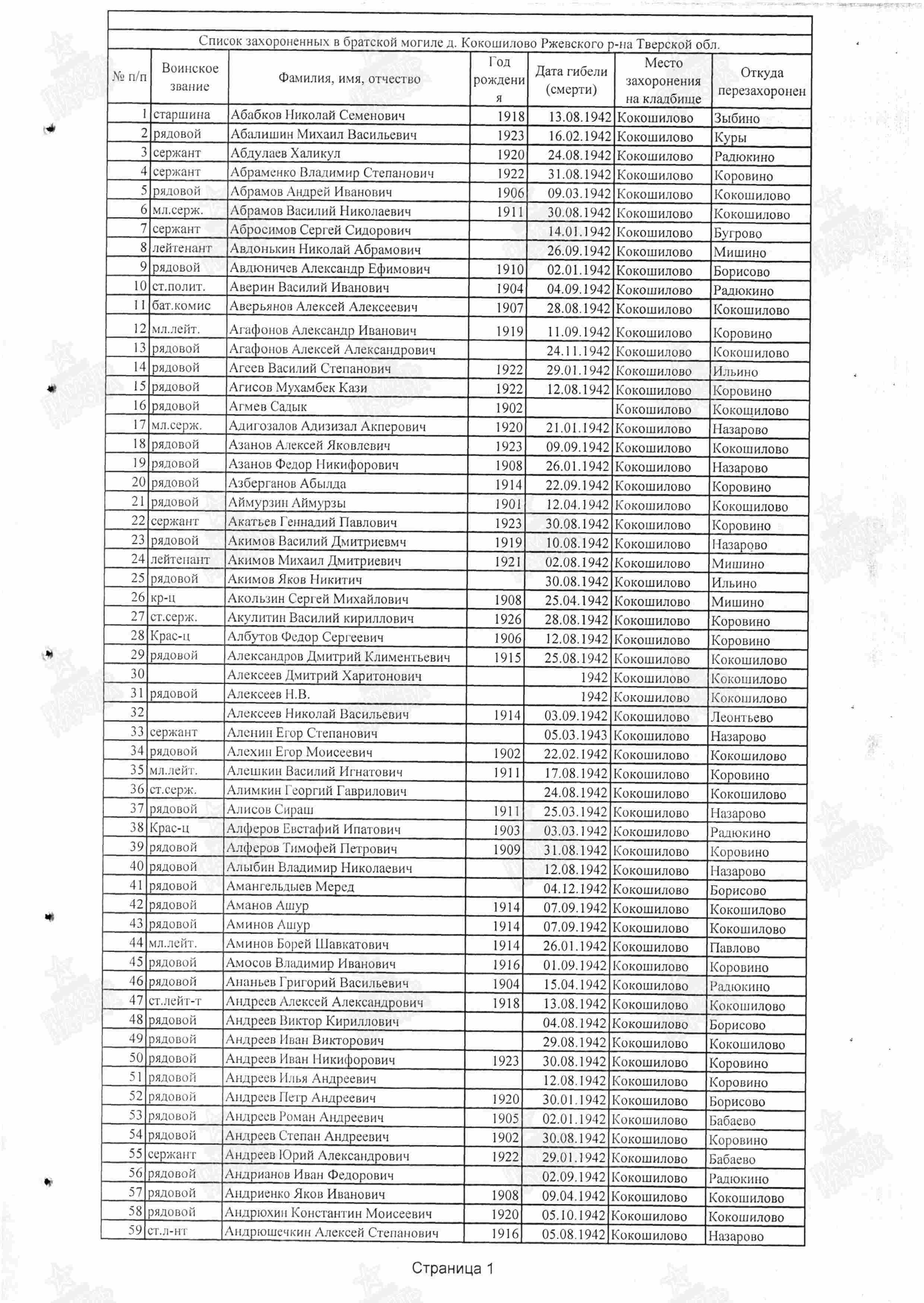 В 1954 году прах перенесен в братскую могилу в д.Кокошилово Ржевского района Калининской области.